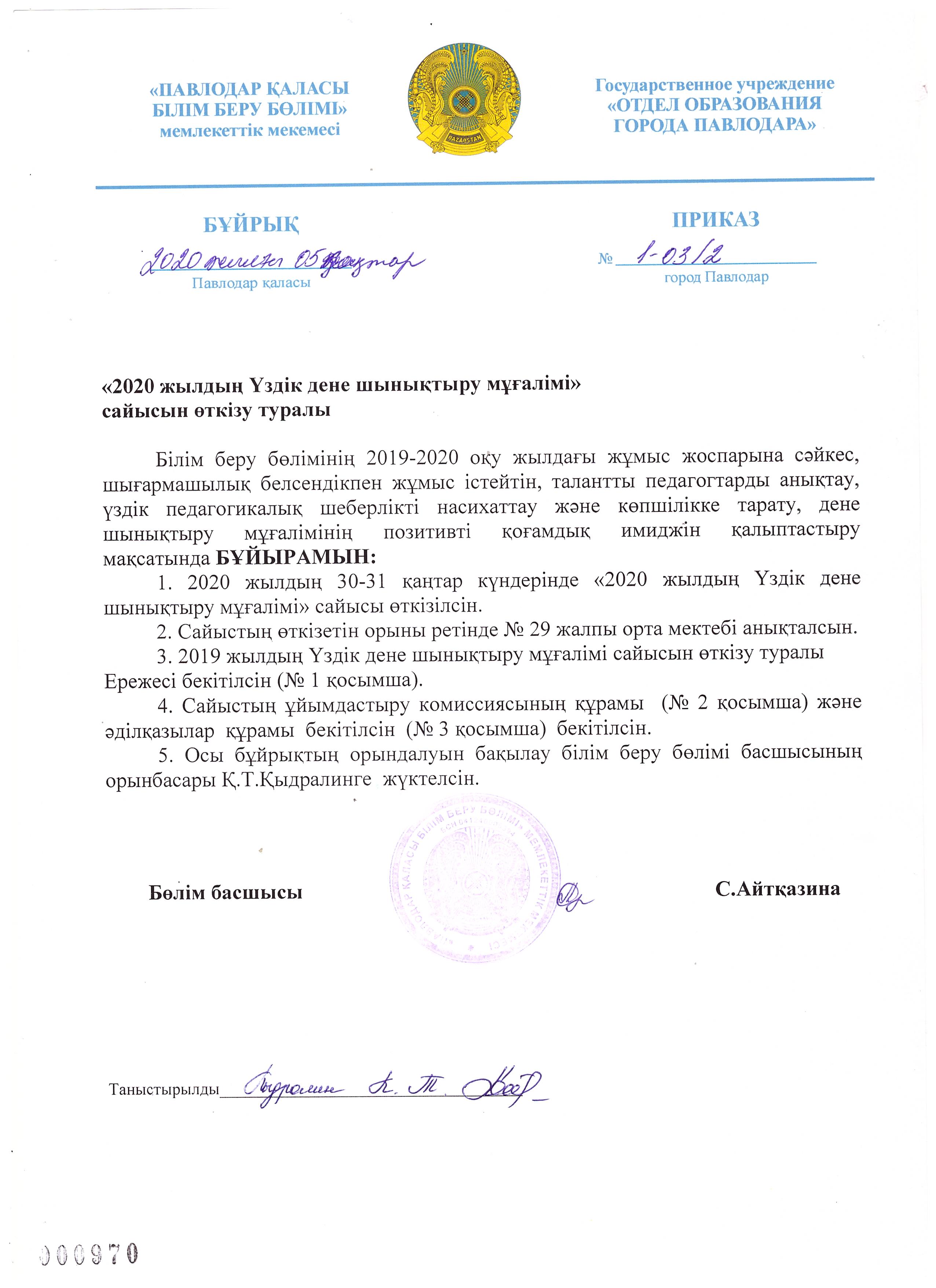 "2020 жылдың Үздік дене шынықтыру мұғалімі" сайысын өткізу туралы | көшіріп алу |
