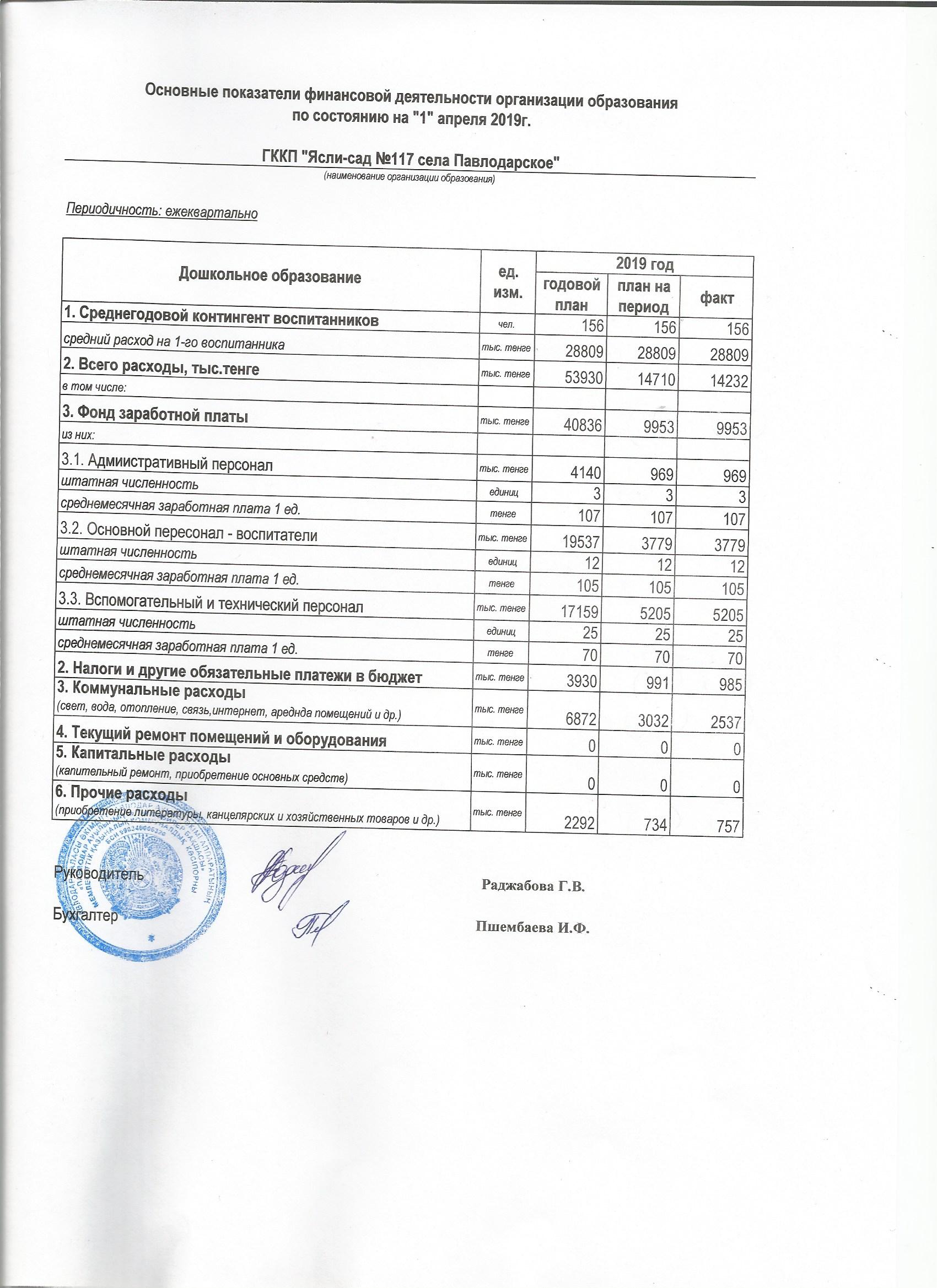 2019 жылғы 1 сәуірге арналған білім беру ұйымдарының қаржылық іс-әрекетінің негізгі көрсеткіштері