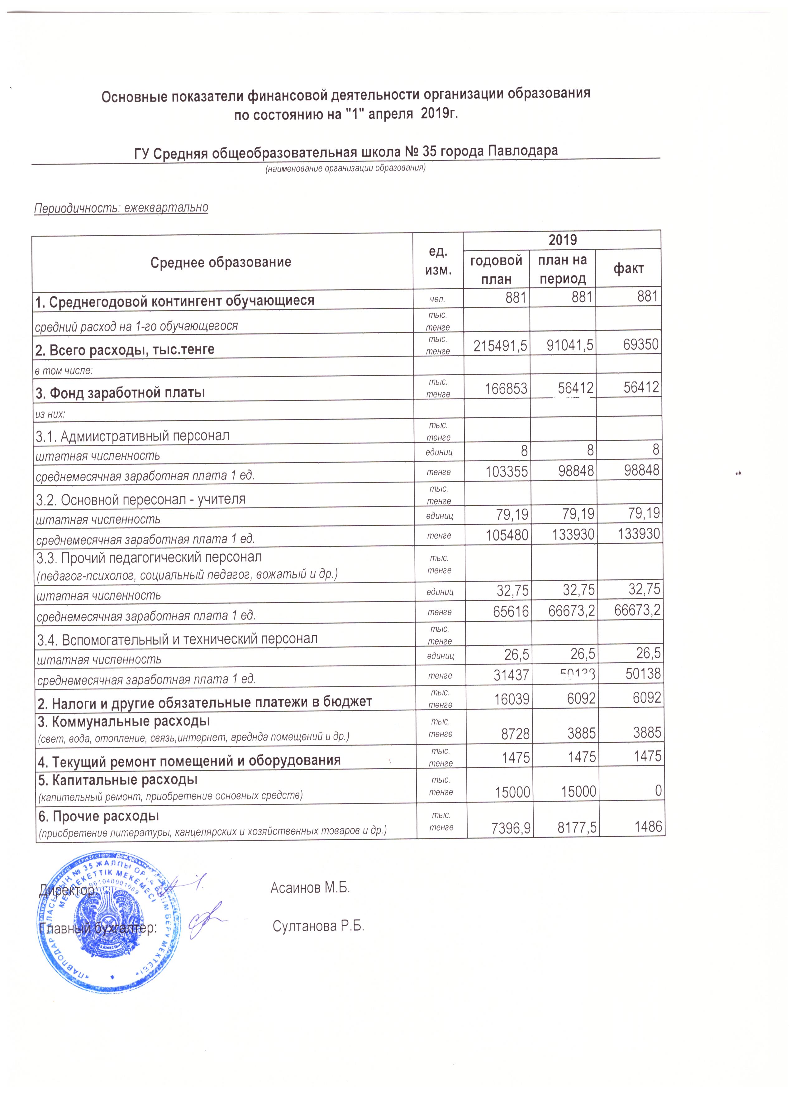 Білім беру ұйымының қаржылық қызметінің негізгі көрсеткіштері 1 мамыр 2019 ж