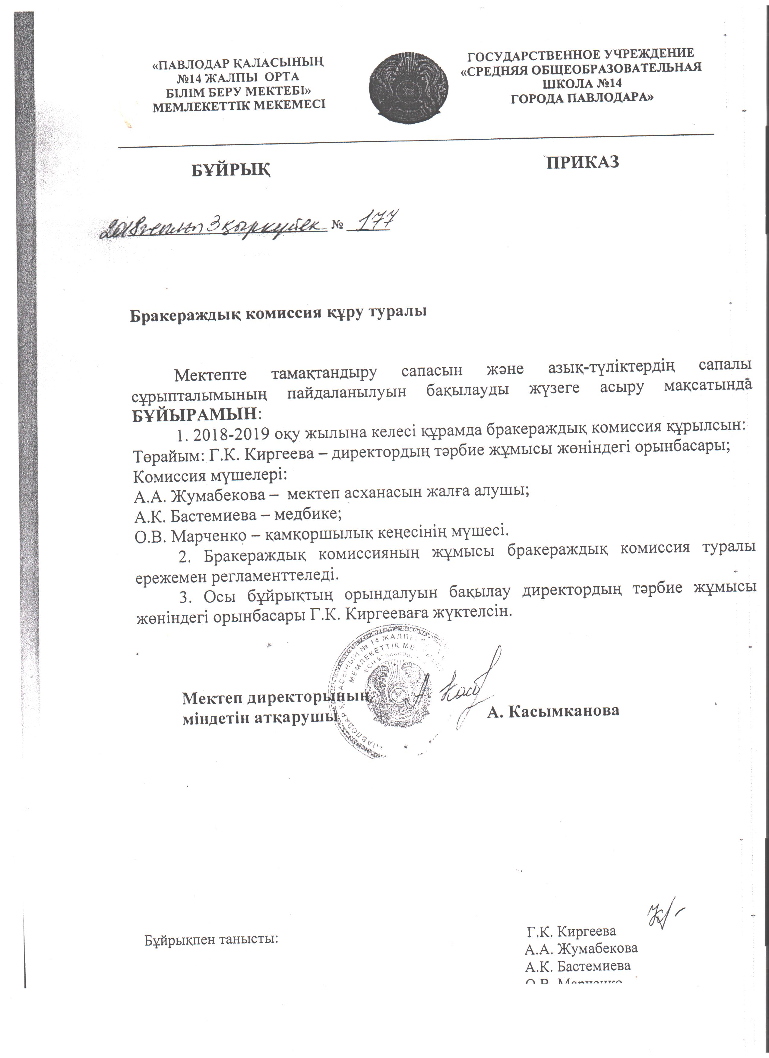 Бракераждық комиссия құру туралы бұйрық | көшіріп алу |