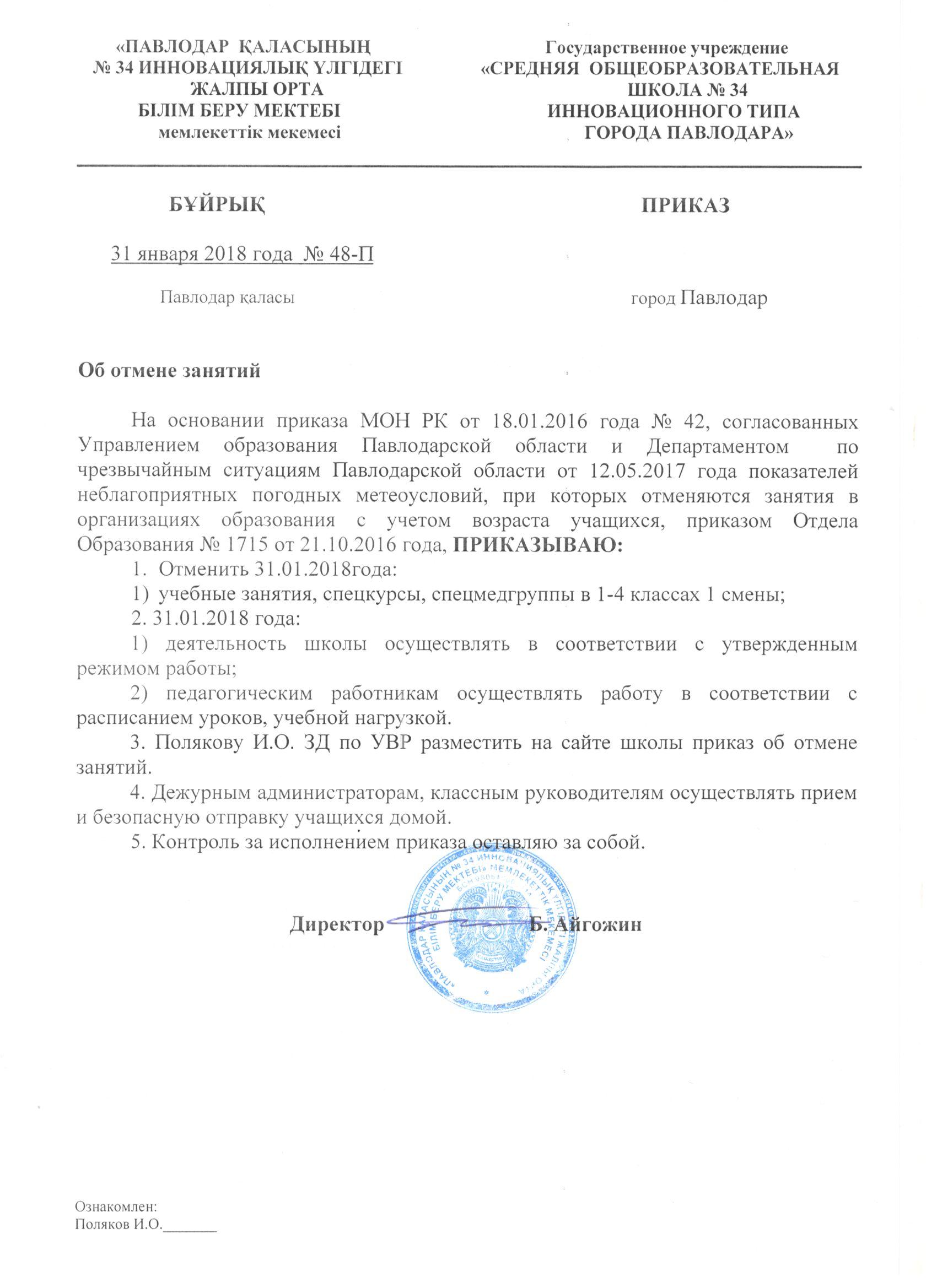 Отмена занятий 1-й смены с 1 по 4 класс 31.01.2018