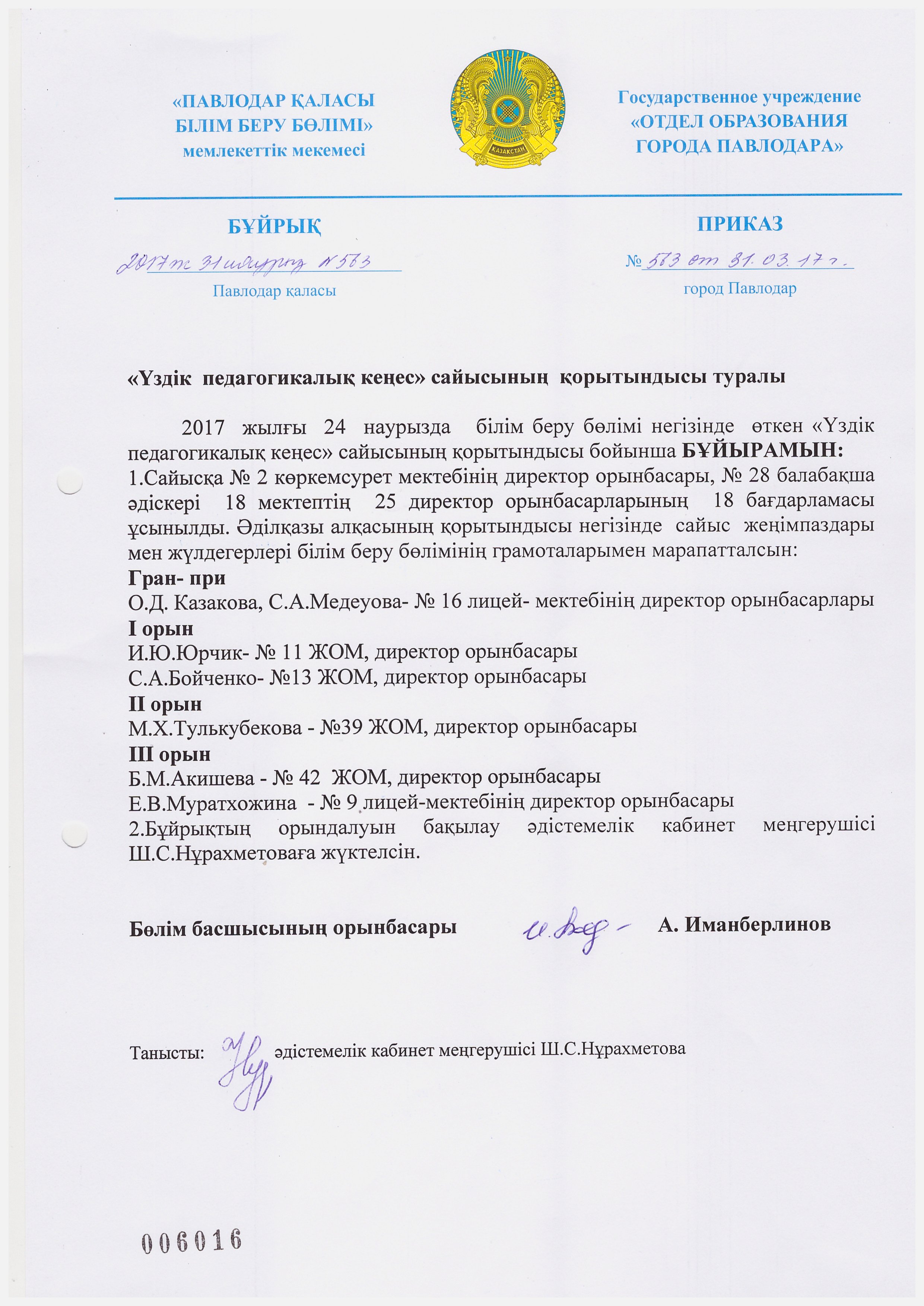 "Үздік педагогикалық кеңес бағдарламасы" сайысының қорытындысы туралы бұйрық | көшіріп алу |