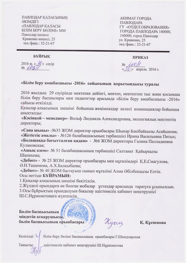 «Білім беру көшбасшысы- 2016» сайысының қорытындысы туралы бұйрық | көшіріп алу |