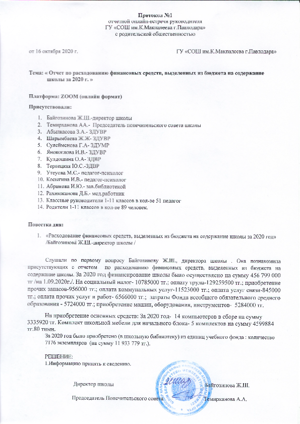 Протокол №1 заседания попечительского совета "Семья и школа вместе" школы №21 г. Павлодара 4 сентября 2020 г | Скачать Смотреть |