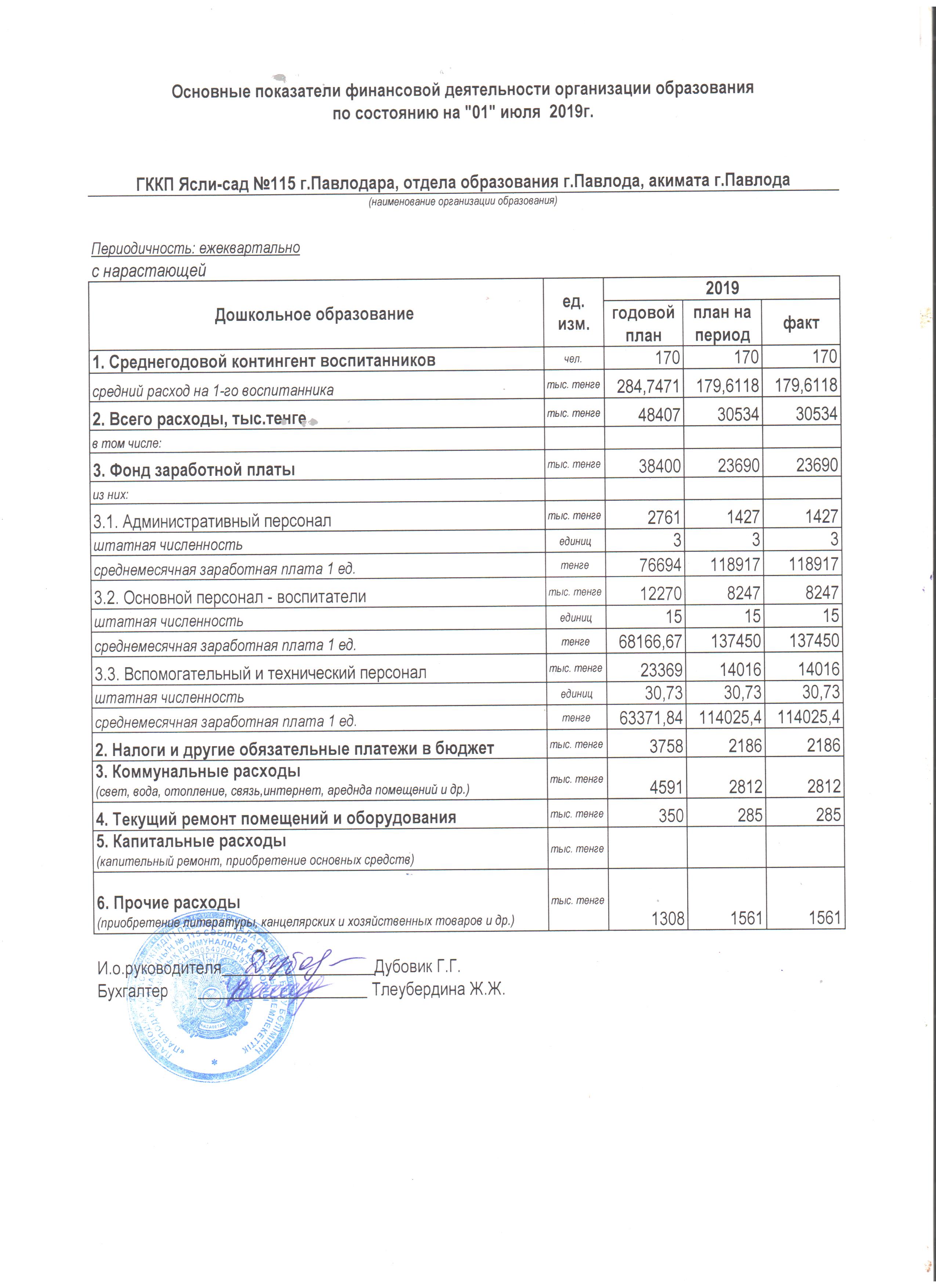Основные показатели финансовой деятельности организации образования по состоянию на "1" июля 2019 г.