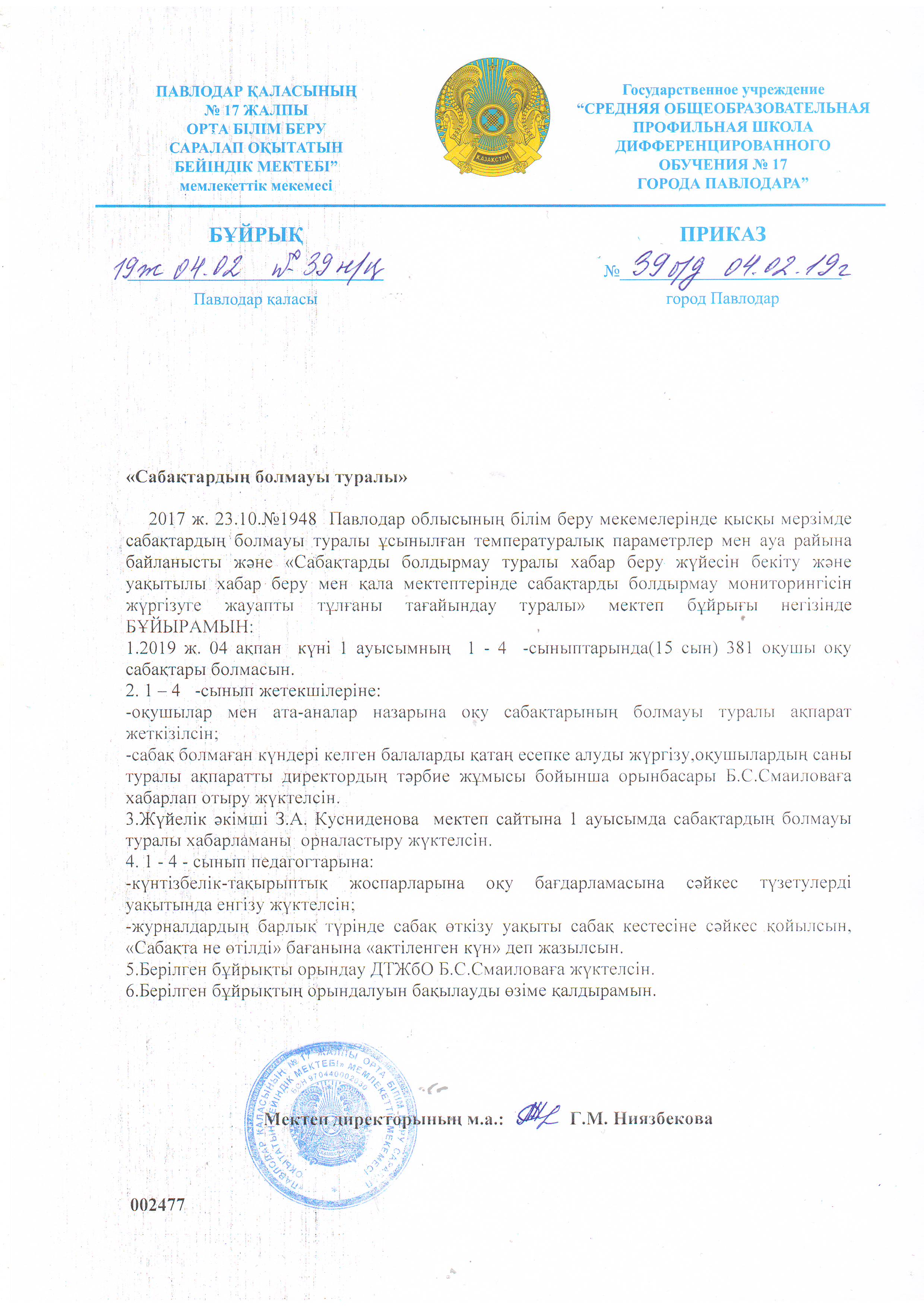 Приказ на отмену занятий 04.02.2019 1смена | Скачать |