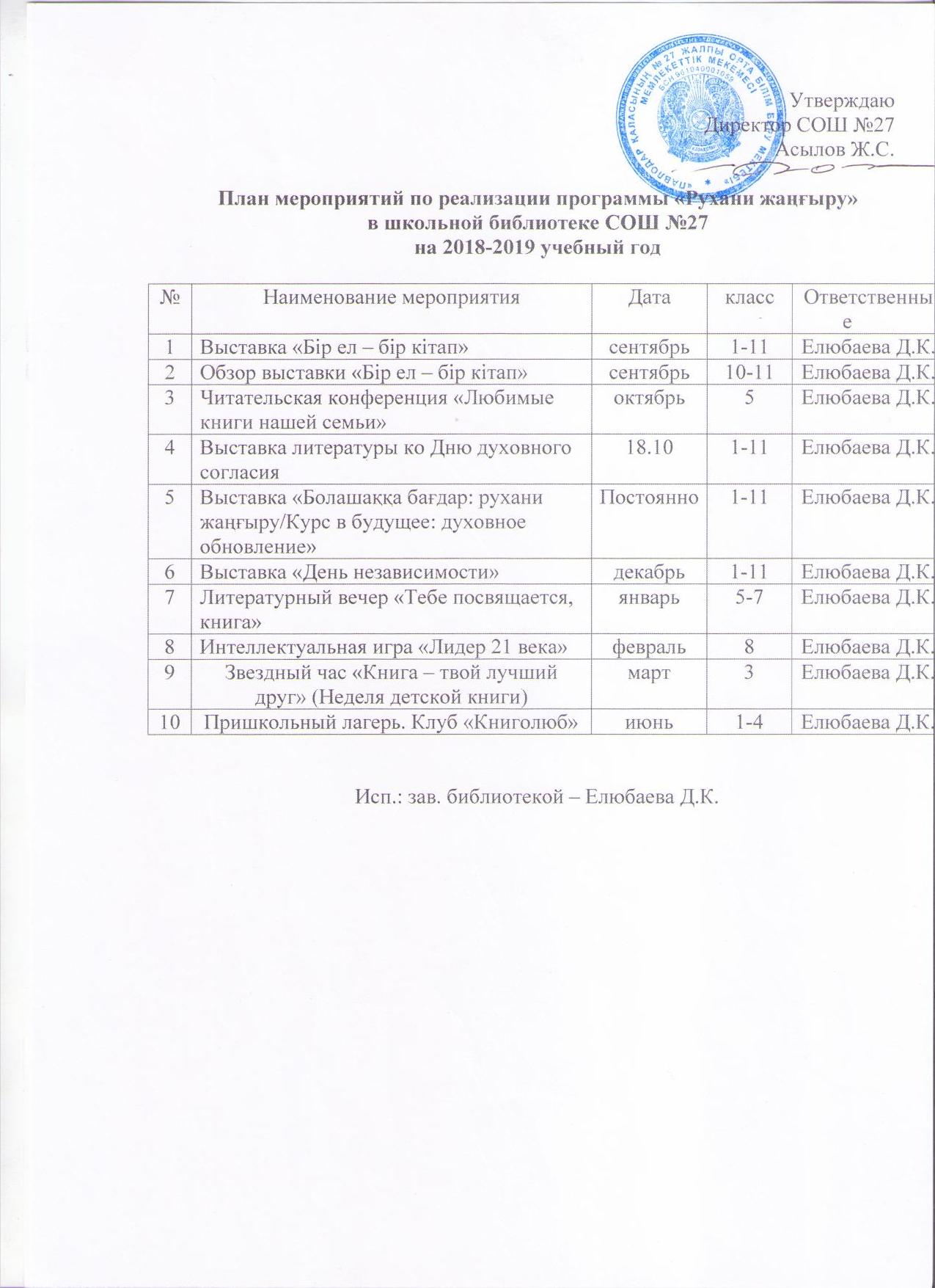 План мероприятий по реализации программы «Рухани жаңғыру» в школьной библиотеке СОШ №27 на 2018-2019 учебный год