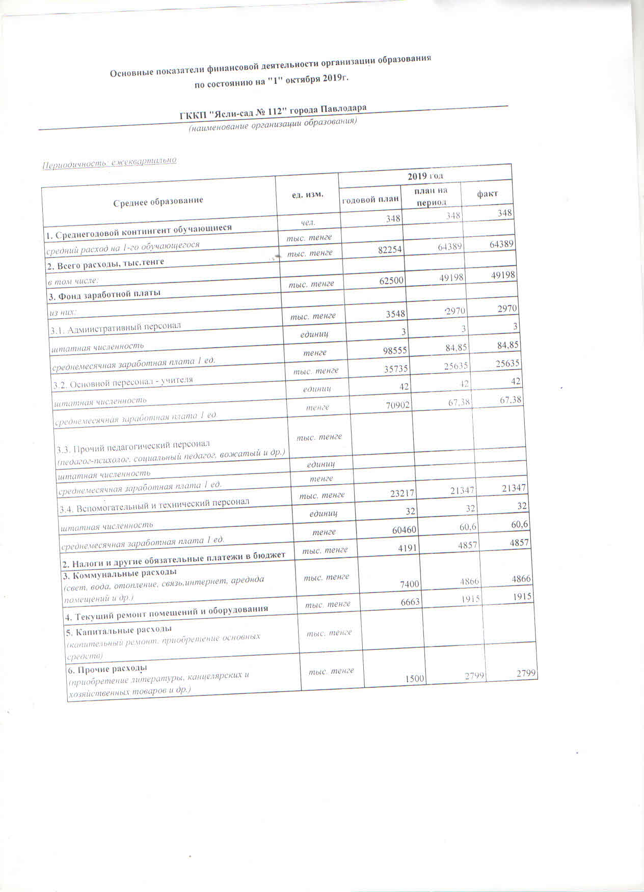 Основные показатели финансовой деятельности организации образования по состоянию на "1" октября 2019 года и за 3 квартал 2019 г.