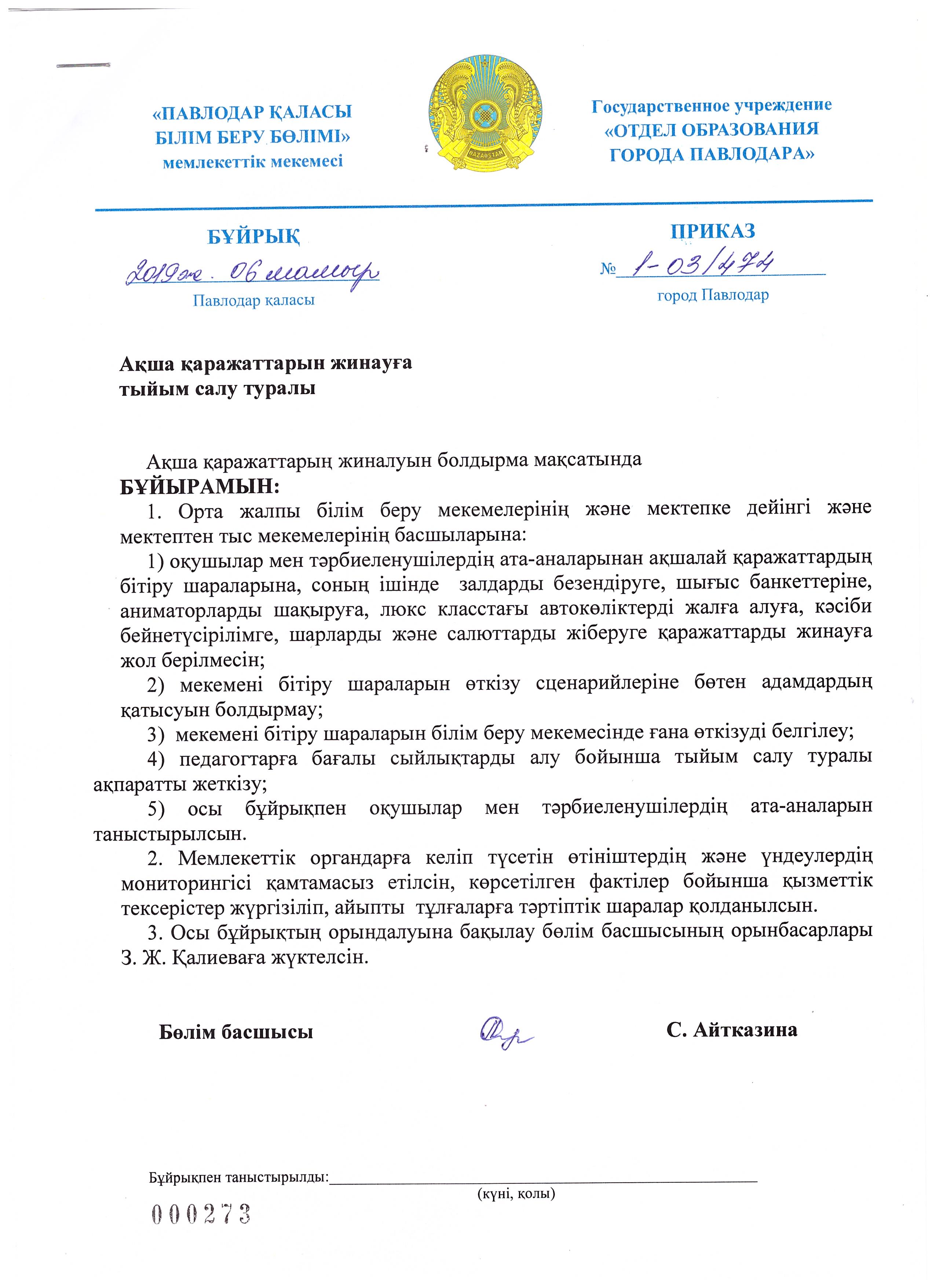 Ақша жинауға тыйым салу туралы | Скачать |
