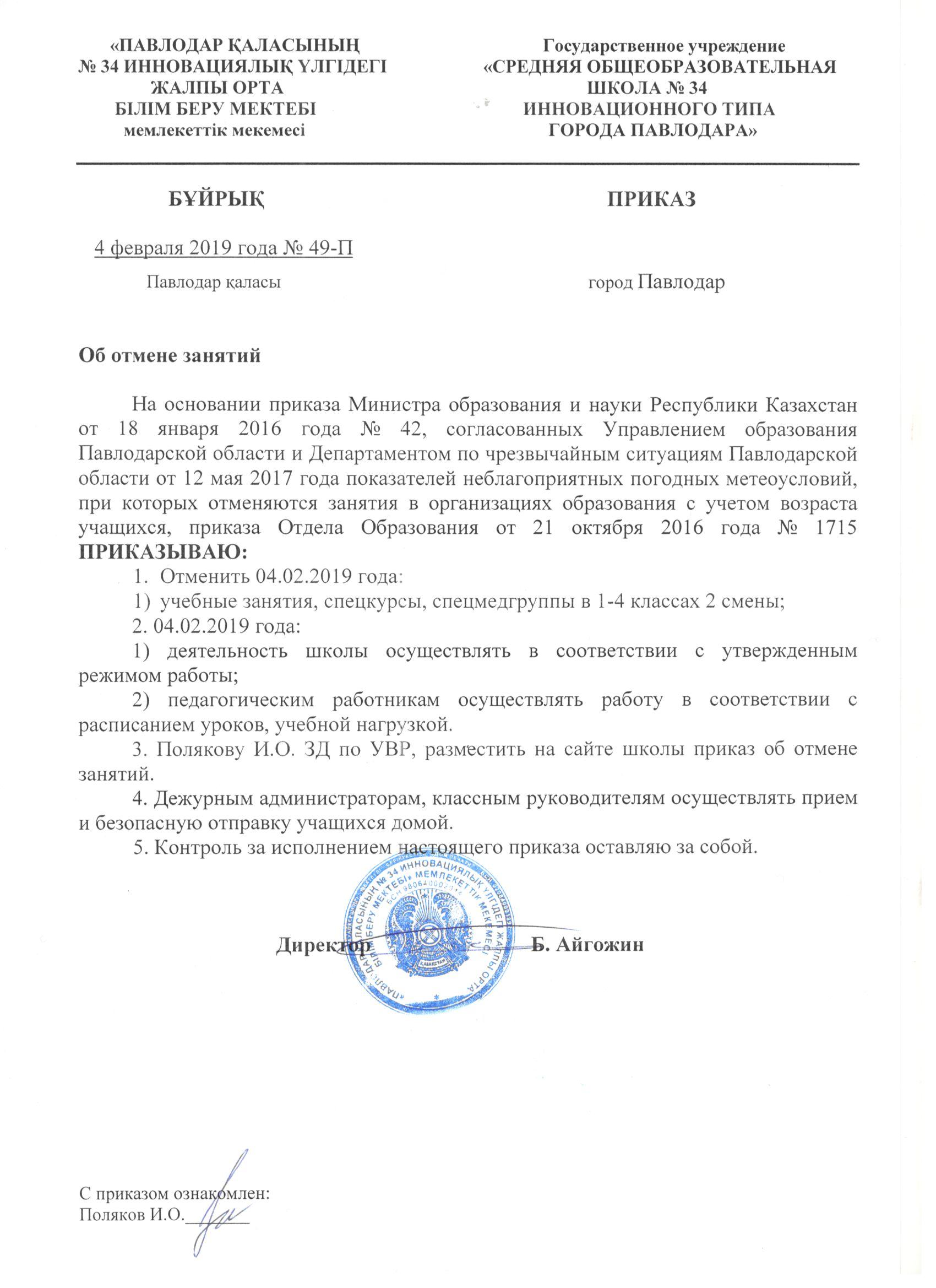 Отмена занятий 1 смена 1-11 классы на 05.02.2019 | Скачать |