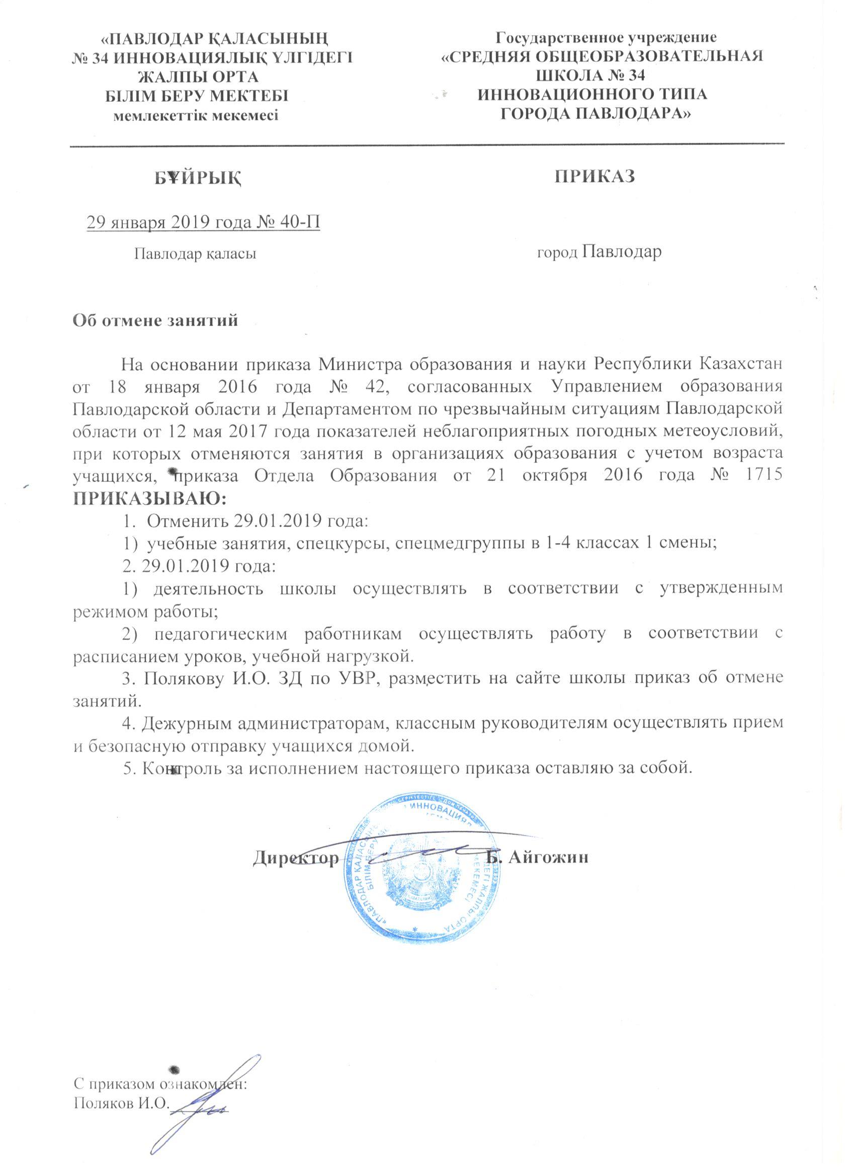 2019 жылғы 29 қаңтар күні 1-ауысымдағы 1-4 сыныптарда сабақтарды тоқтату туралы | көшіріп алу |