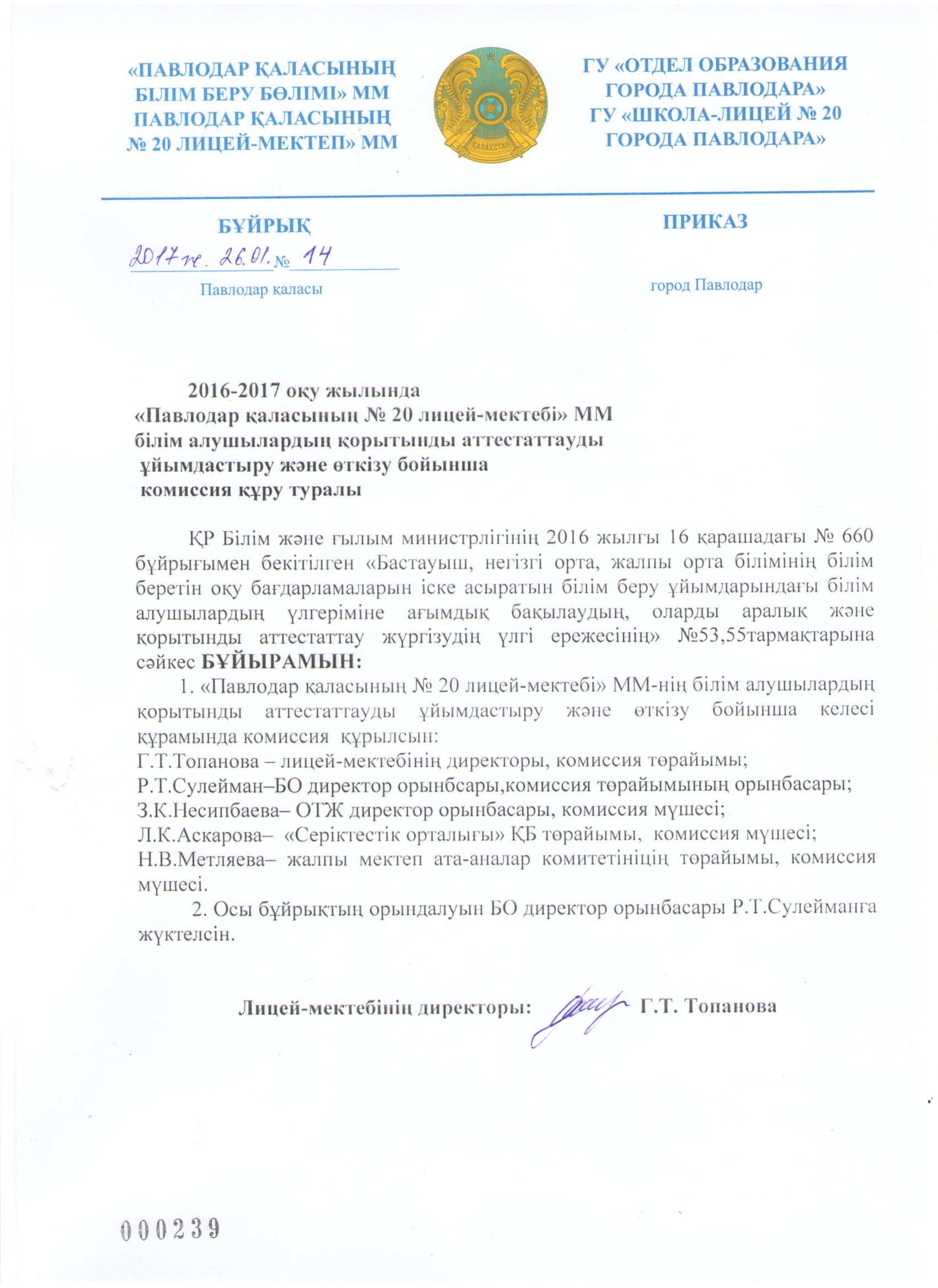 Приказ о создании комиссии для организации и проведения итоговой аттестации выпускников обучающихся ГУ "Школа-лицей №20 города Павлодара" в 2016-2017 учебном году | Скачать |
