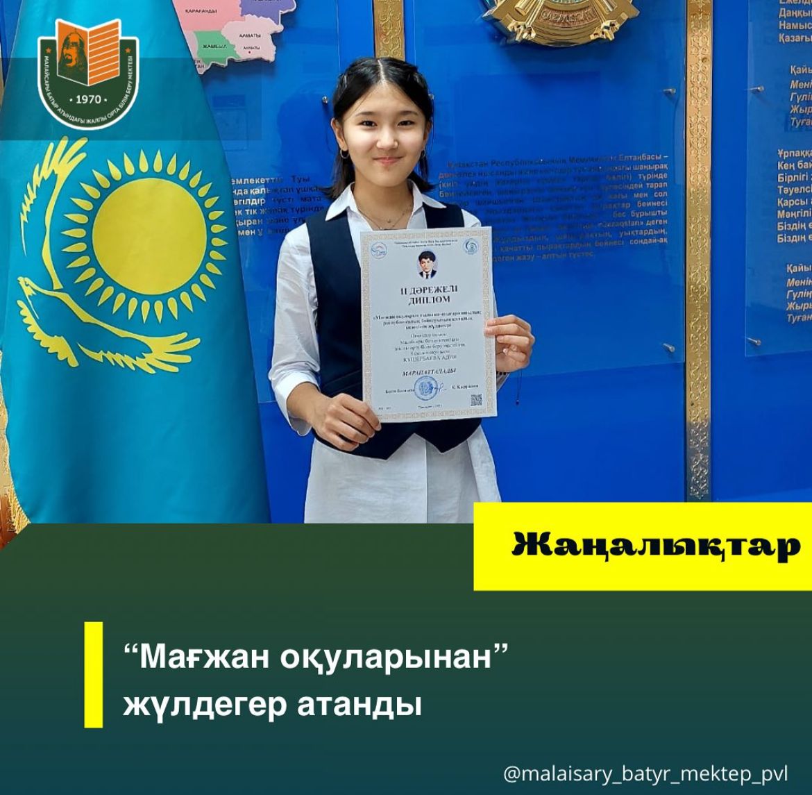 2023 жылдын 19- кыркуйек куні калалык «Мағжан окулары» ғылыми- шығармашылық республикалык байкауынын 2- орын жулдегері 8 «а» сынып окушысы Адия Кушербаеваны жеңісімен құттыктаймыз. | Скачать |