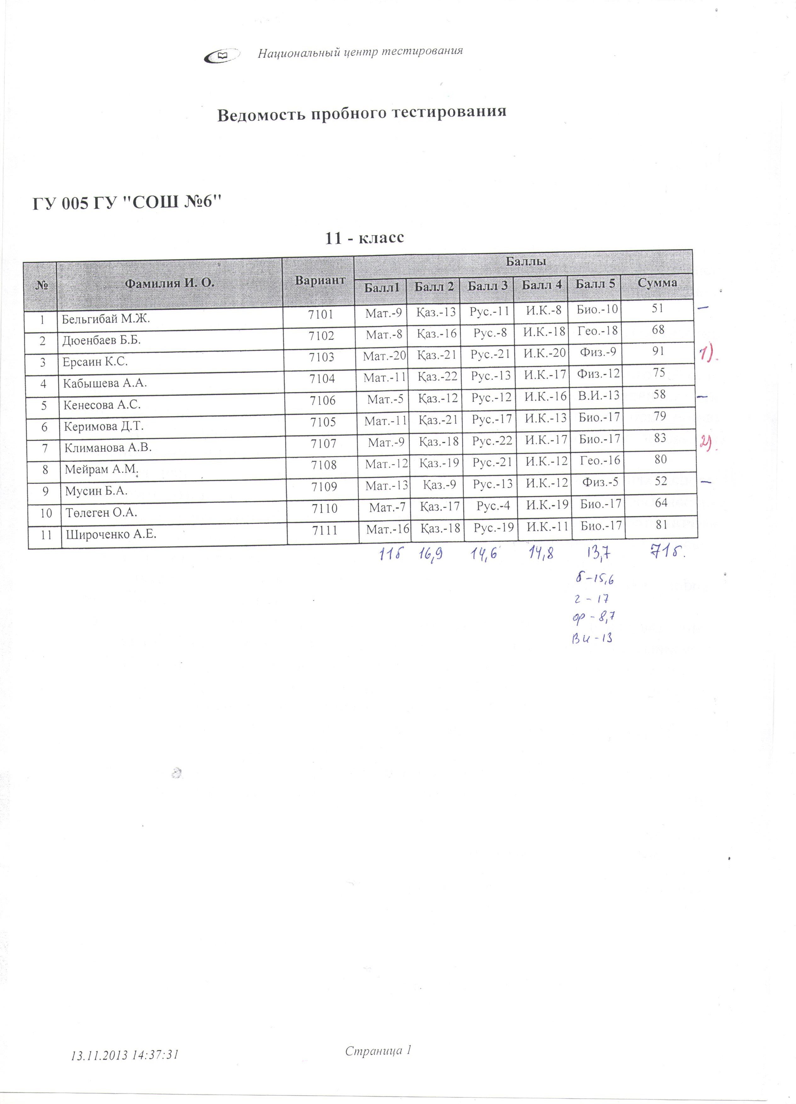 Результаты пробного тестирования учащихся от 13.11.2013 года