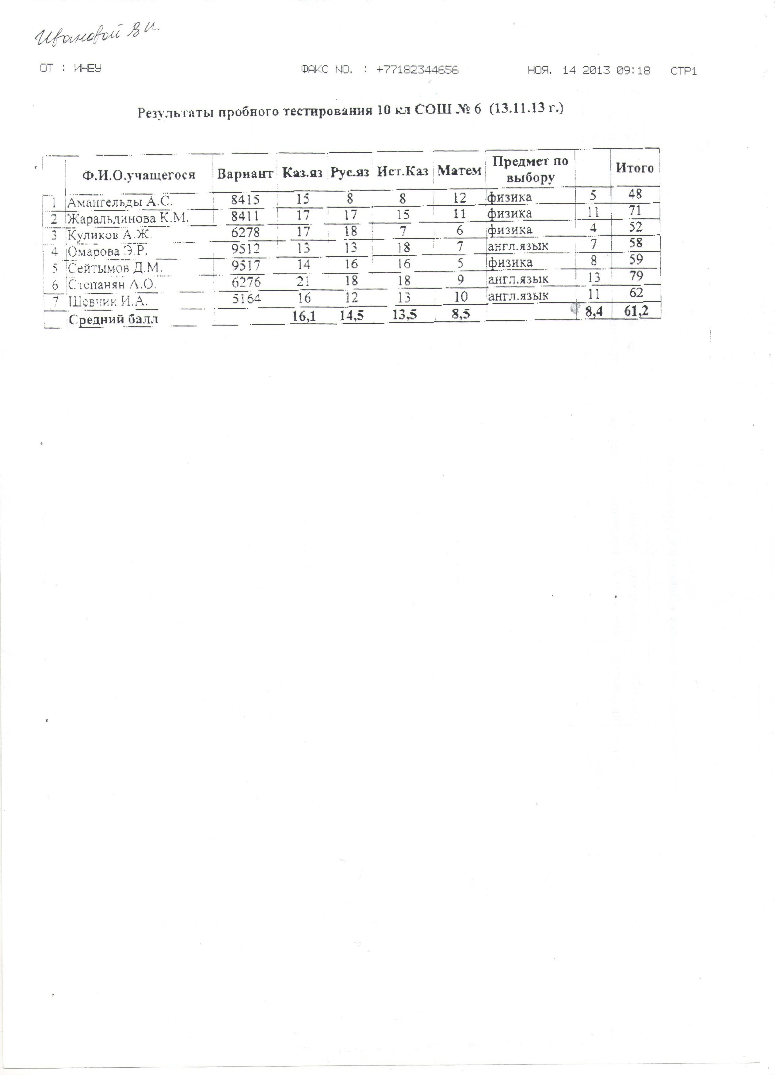 Результаты пробного тестирование ЕНТ от 25.10.2013г.