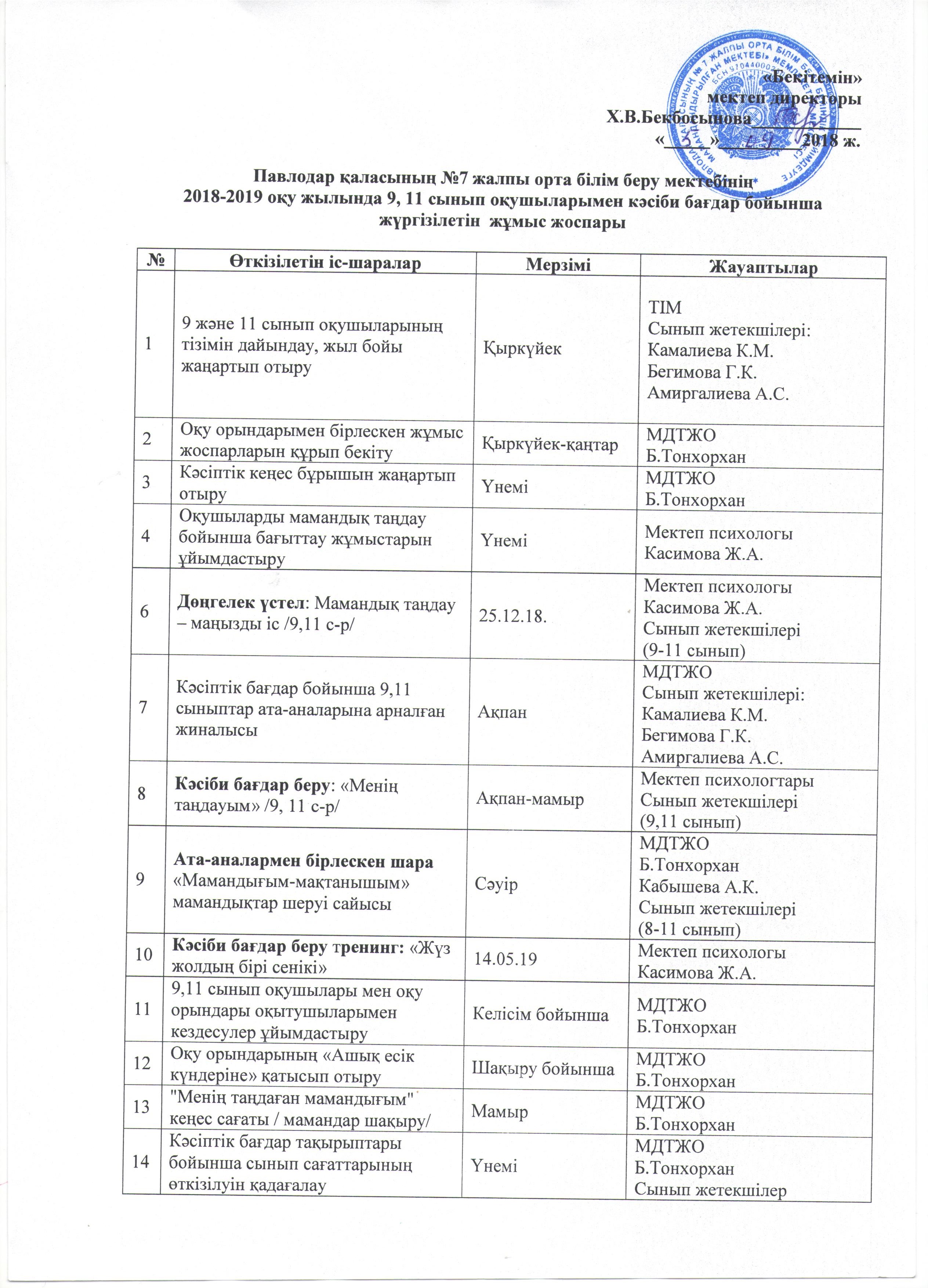 Кәсіби бағдар бойынша 9,11 сыныптармен жүргізілетін жұмыс жоспары