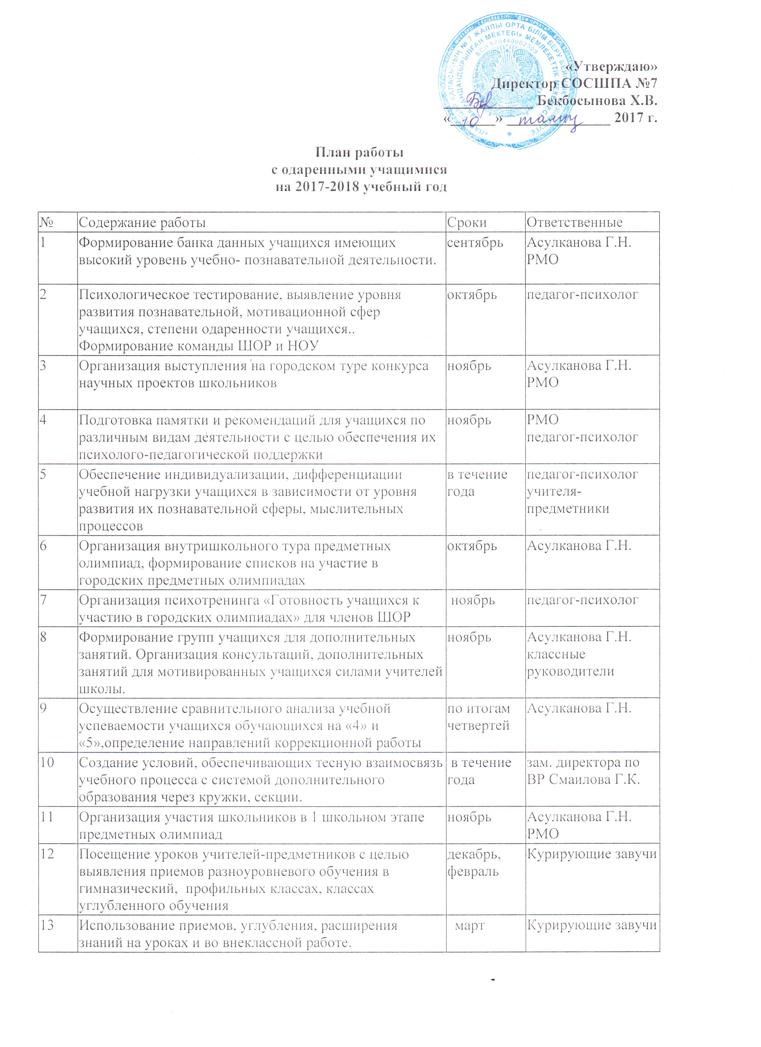 Дарынды балалармен жұмыс жоспары