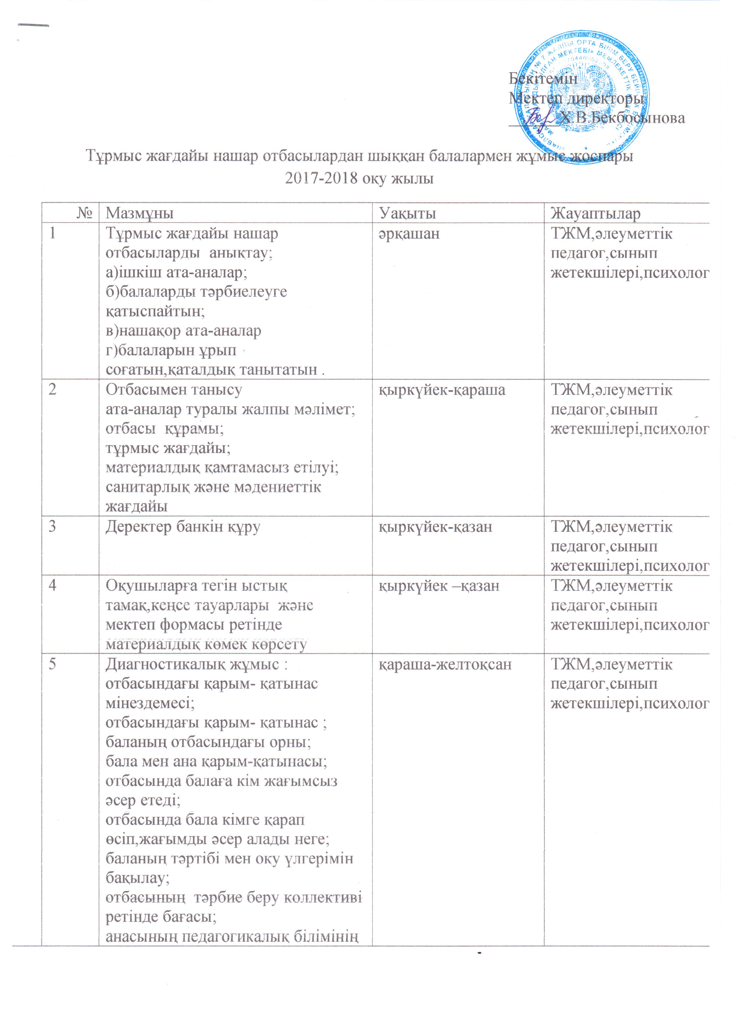 Тұрмыс жағдайы нашар отбасылардан шыққын балалармен жұмыс жоспары 2017-2018 оқу жылы