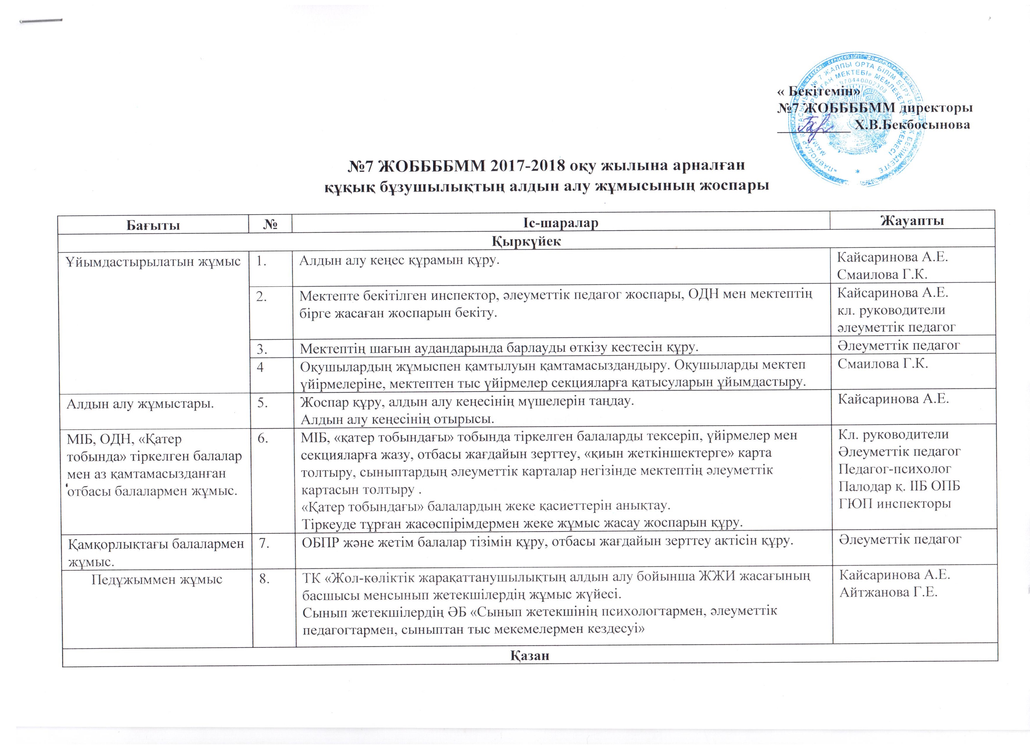 2018-2019 оқу жылына арналған құқық бұзушылықтың алдын алу жұмысының жоспары