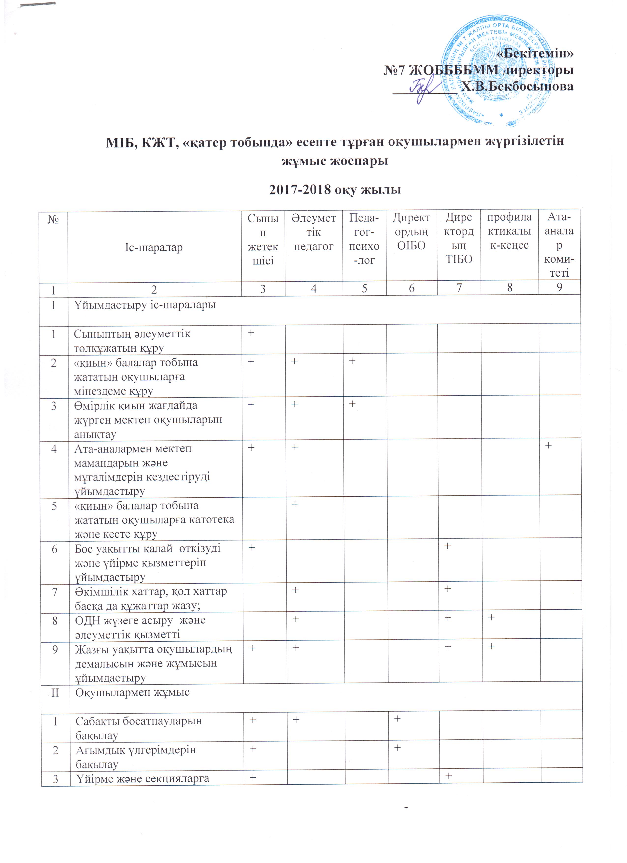 МІБ, КЖТ, "қатер тобында" есепте тұрған оқушылармен жүргізілетін жұмыс жоспары 2017-2018 оқу жылы | көшіріп алу |