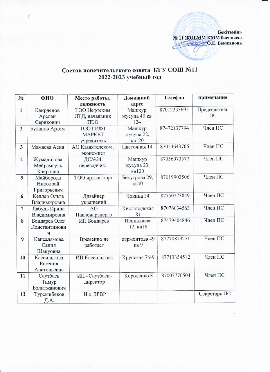 Протокол №1 заседания Попечительского совета "КГУ Средняя общеобразовательная школа № 11"