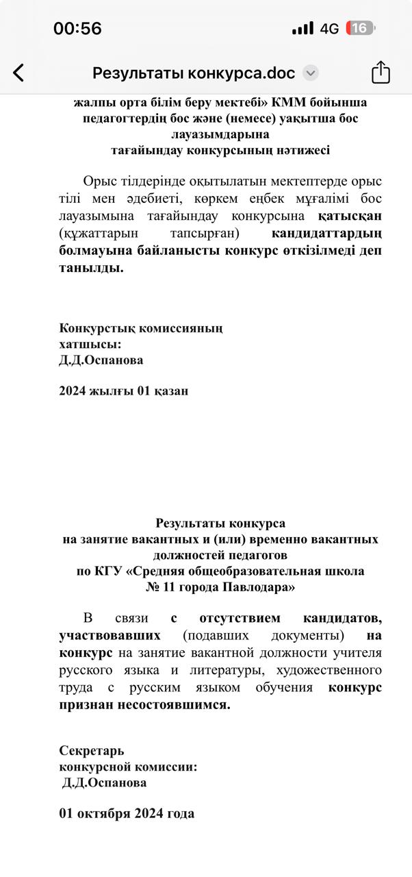 «Павлодар қаласының №11 жалпы орта білім беру мектебі» КММ бойынша қазақ тілі мен әдебиеті пәнінің мұғалімі бос лауазымына тағайындау конкурсының нәтижесі. | Скачать Смотреть |