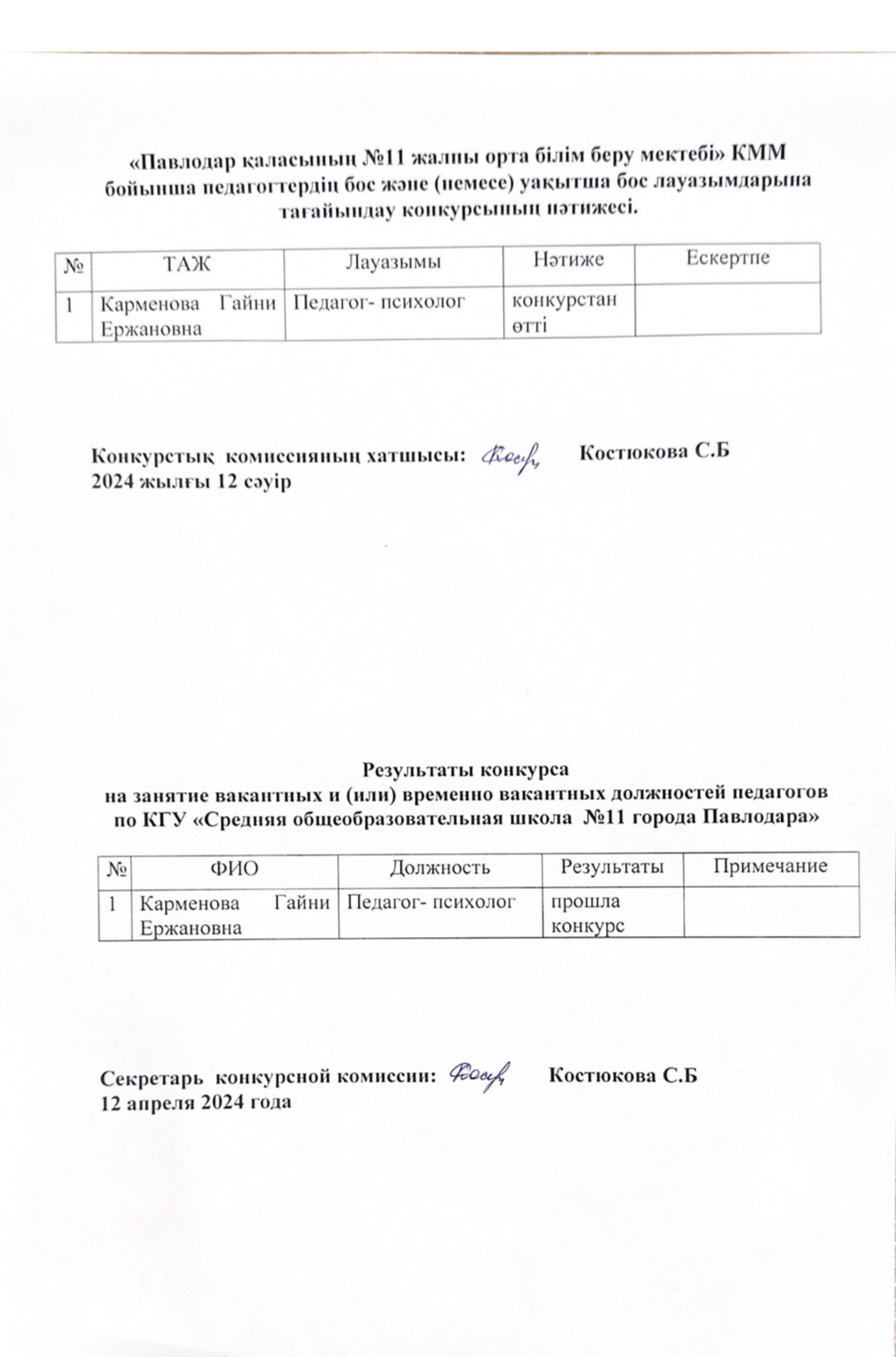 Результаты конкурса на занятие вакантных и (или) временно вакантных должностей педагогов по КГУ «Средняя общеобразовательная школа №11 города Павлодара» | Скачать Смотреть |