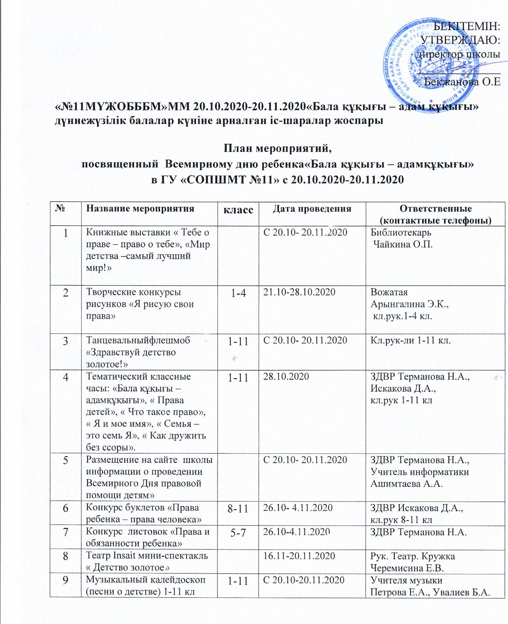Дүниежүзілік балалар күніне арналған іс-шаралар жоспары