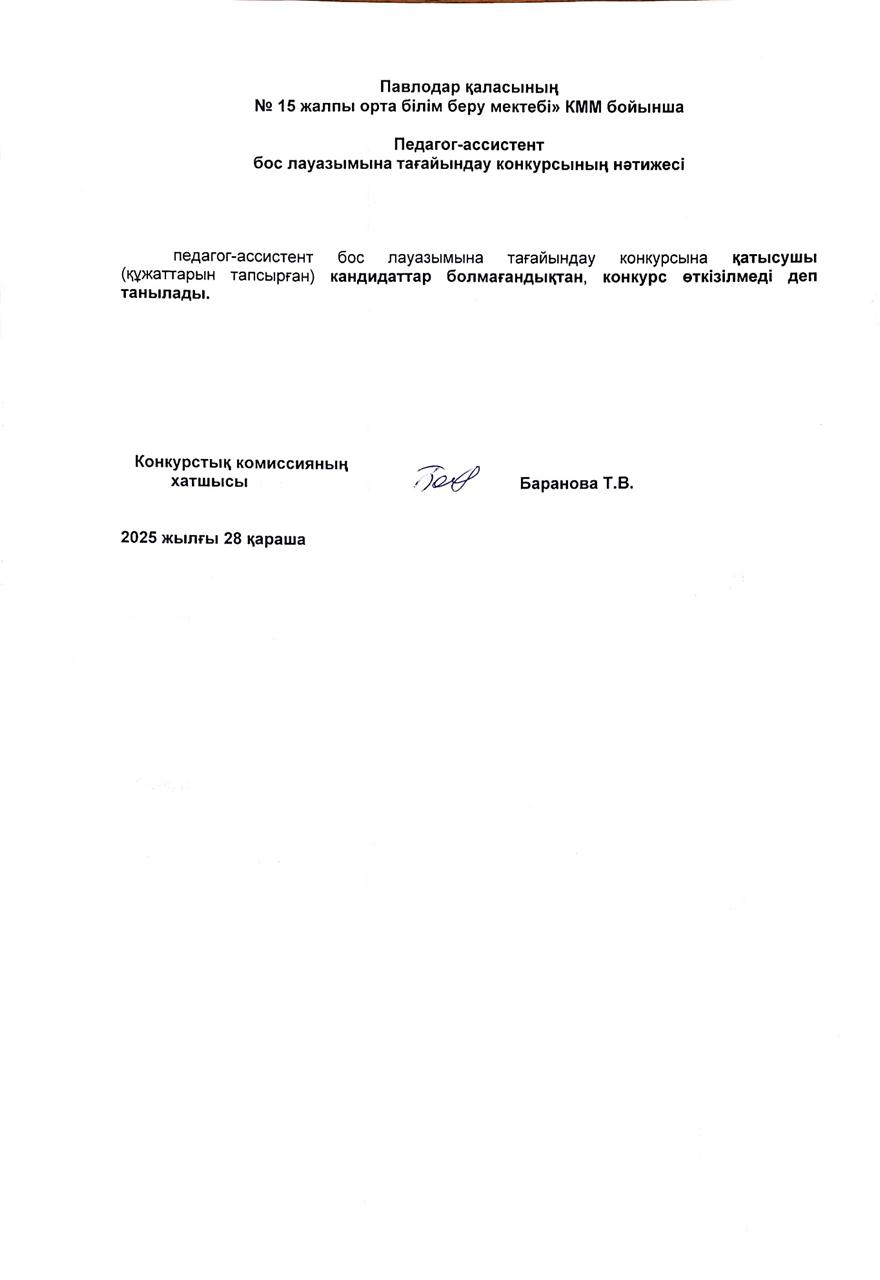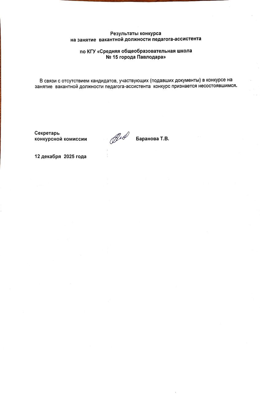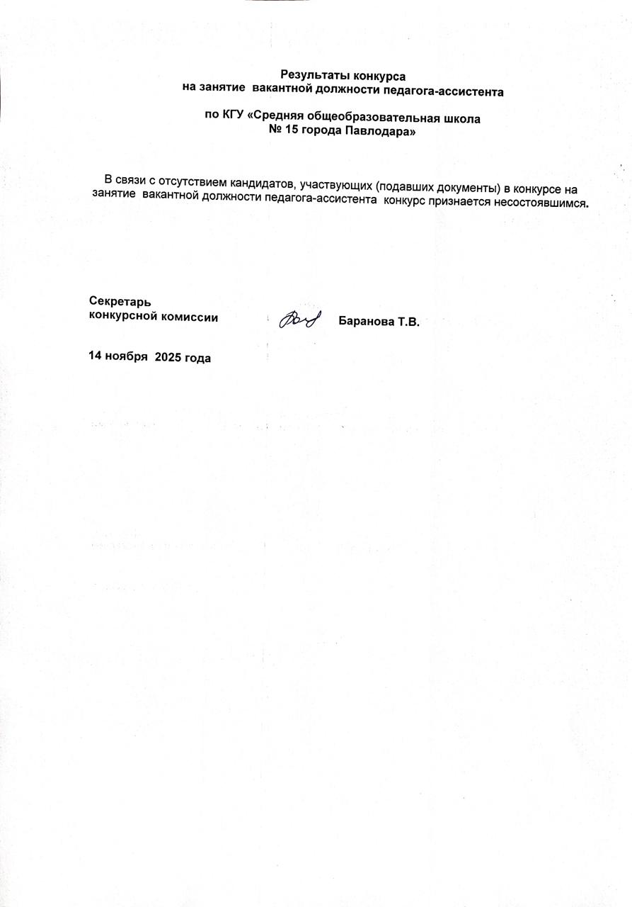 КГУ "Средняя общеобразовательная школа №15 города Павлодара" отдела образования города Павлодара, управления образования Павлодарской области объявляет конкурс на должность педагога-ассистента с русским языком обучения