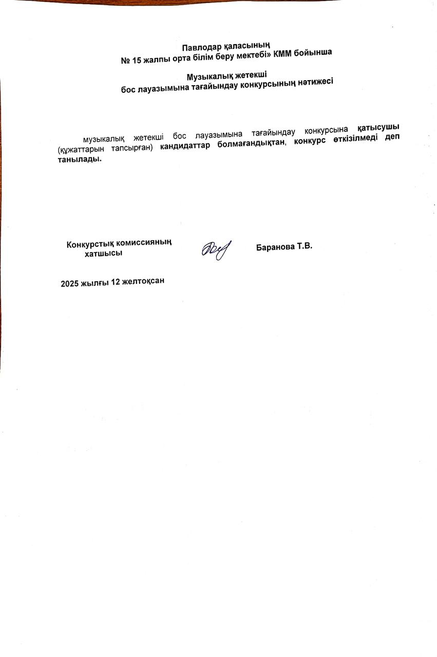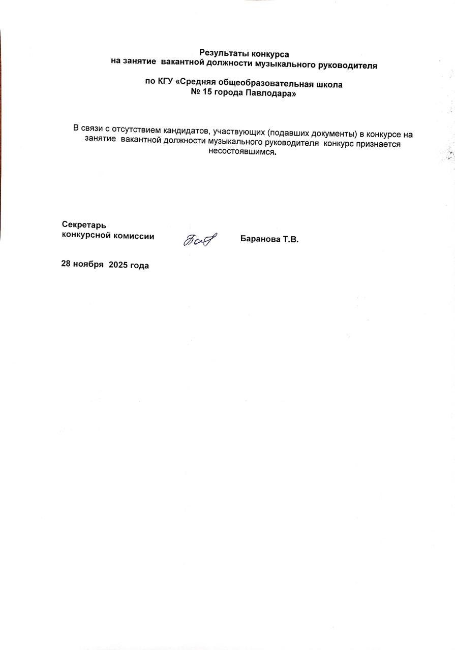 КГУ "Средняя общеобразовательная школа №15 города Павлодара" отдела образования города Павлодара, управления образования Павлодарской области объявляет конкурс на должность музыкального руководителя с русским языком обучения (на постоянную вакантную должность)