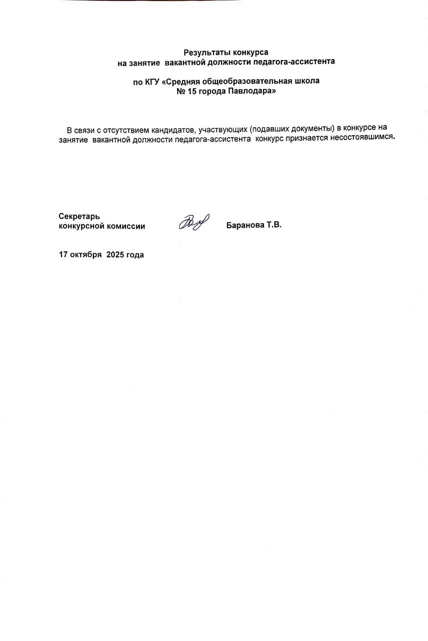 Павлодар облысының білім беру басқармасы, Павлодар қаласы білім беру бөлімінің "Павлодар қаласының №15 жалпы орта білім беру мектебі" КММ, орыс тілінде оқытатын педагог-ассистент лауазымына конкурс жариялайды | Скачать Смотреть |