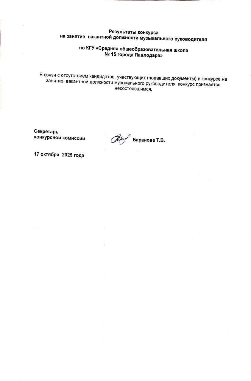 Павлодар облысының білім беру басқармасы, Павлодар қаласы білім беру бөлімінің "Павлодар қаласының №15 жалпы орта білім беру мектебі" КММ, орыс тілінде оқытатын музыка жетекшісі лауазымына конкурс жариялайды (тұрақты бос лауазымына) | Скачать Смотреть |
