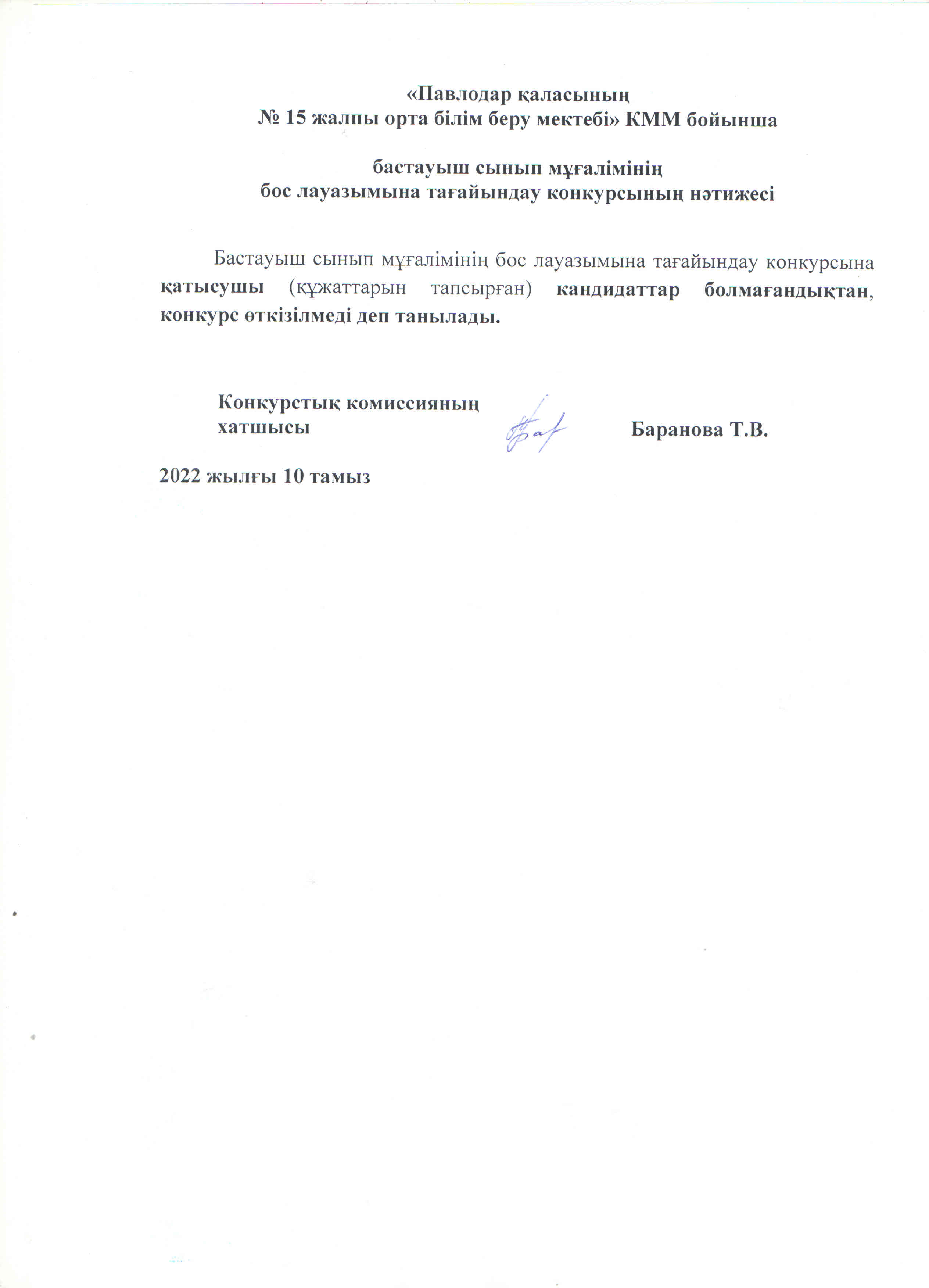 «Павлодар қаласының № 15 жалпы орта білім беру мектебі» КММ бойынша бастауыш сынып мұғалімінің бос лауазымына тағайындау конкурсының нәтижесі | Скачать |