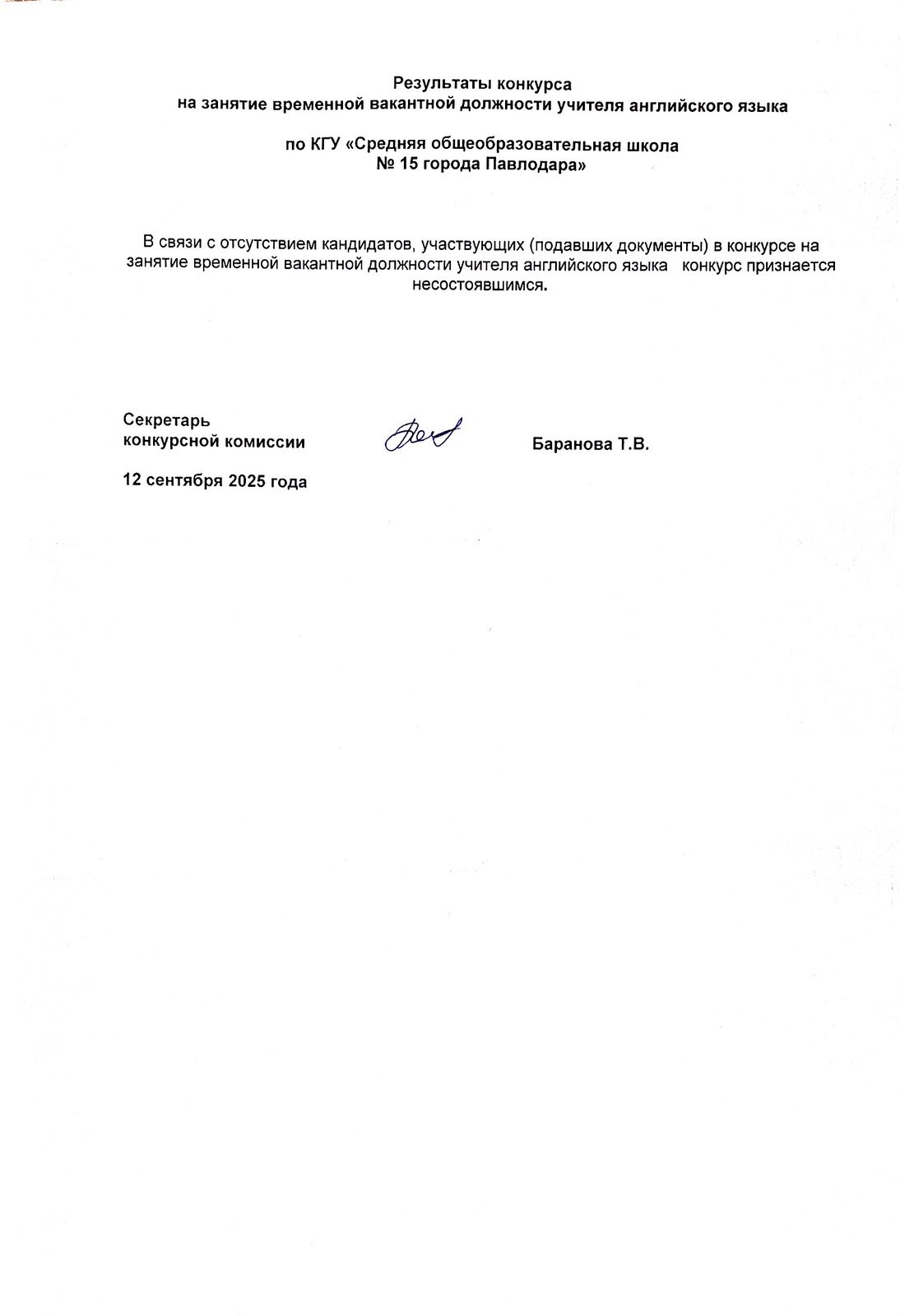 Павлодар облысының білім беру басқармасы, Павлодар қаласы білім беру бөлімінің "Павлодар қаласының №15 жалпы орта білім беру мектебі" КММ, орыс тілінде оқытатын ағылшын тілі мұғалімі лауазымына конкурс жариялайды (уақытша бос орынға) | Скачать Смотреть |