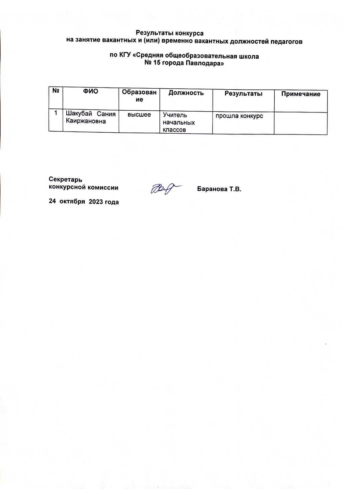 «Павлодар қаласының №15 жалпы орта білім беретін мектебі» КММ орыс тілінде оқытатын сыныптарда бастауыш сынып мұғалімінің бос лауазымына конкурс қорытындысының күшін жою туралы бұйрығы | Скачать |