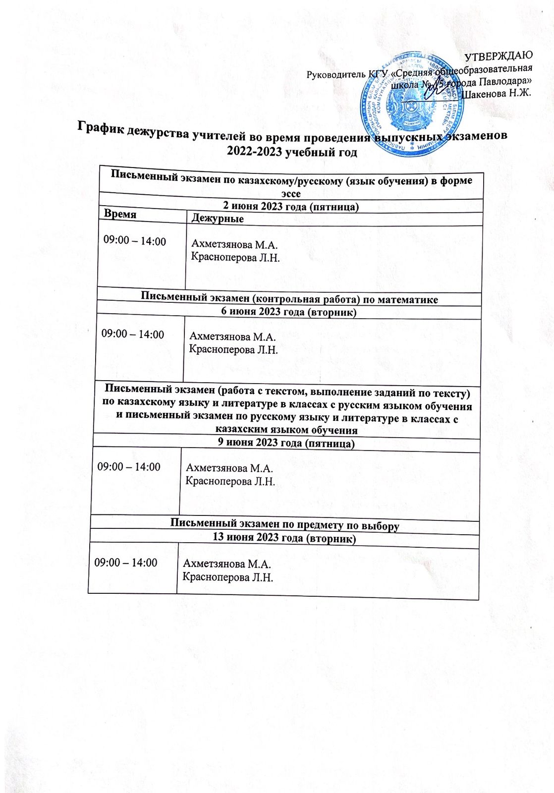 График дежурства учителей во время проведения выпускных экзаменов 2022-2023 учебный год