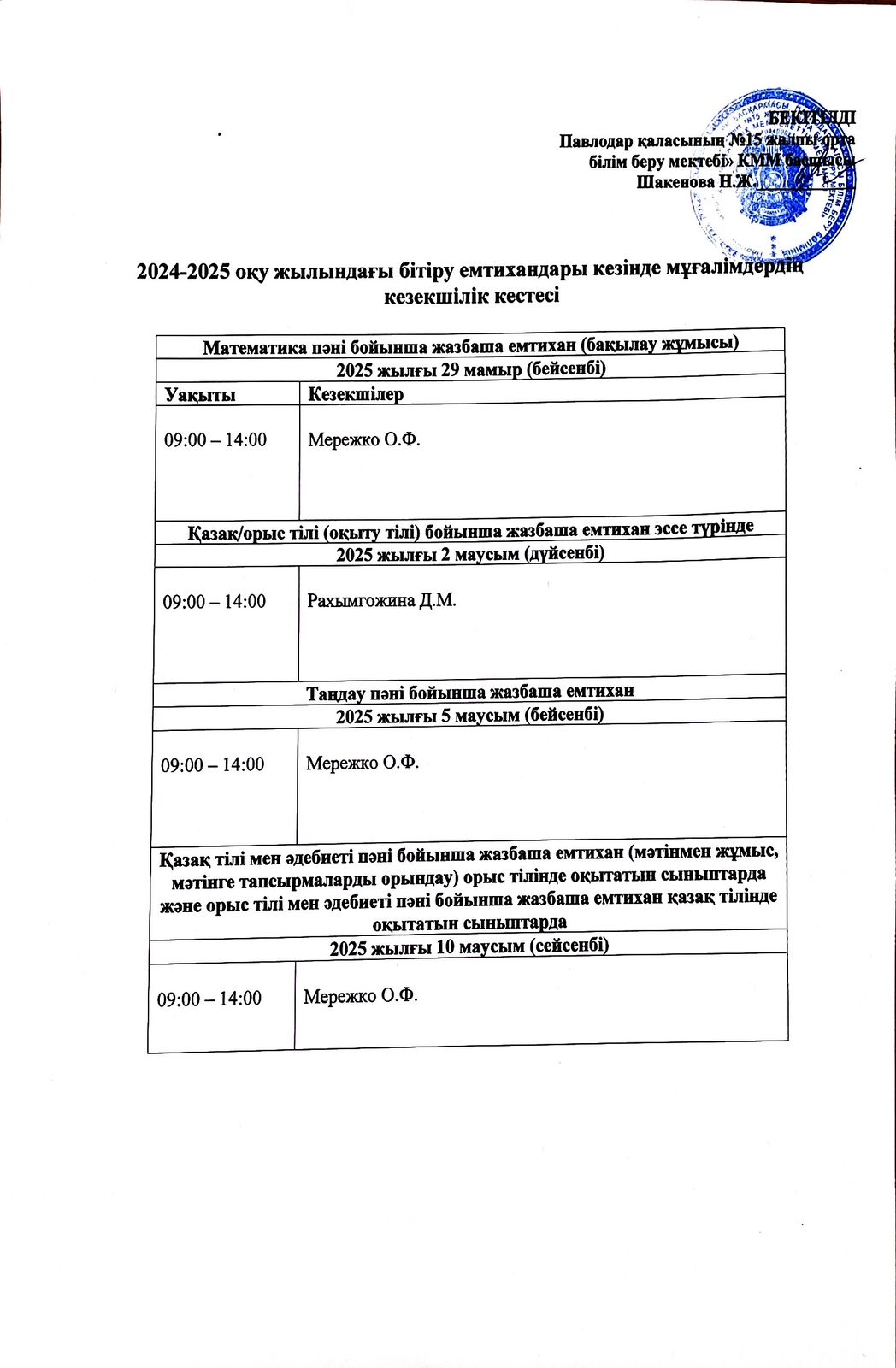 График дежурства учителей во время проведения выпускных экзаменов 2024-2025 учебный год