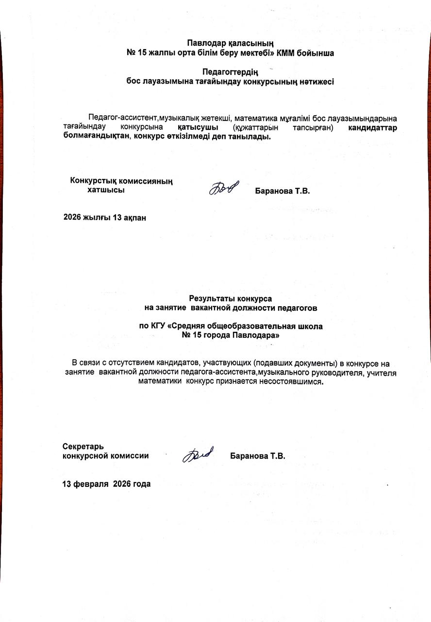 Павлодар облысының білім беру басқармасы, Павлодар қаласы білім беру бөлімінің "Павлодар қаласының №15 жалпы орта білім беру мектебі" КММ, орыс тілінде оқытатын математика мұғалімі лауазымына конкурс жариялайды | көшіріп алу қарау |