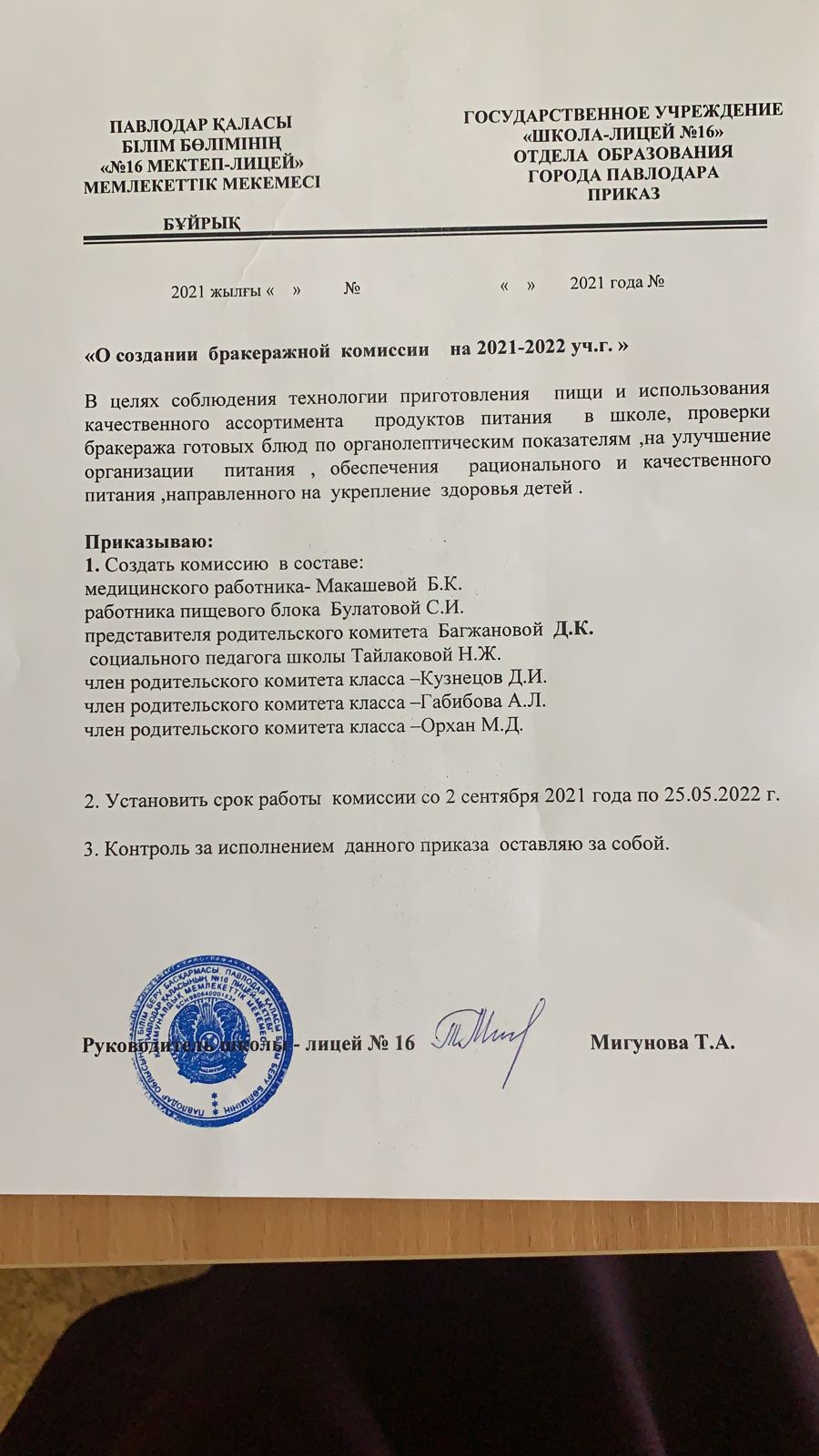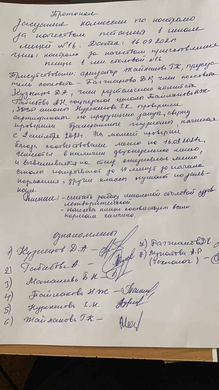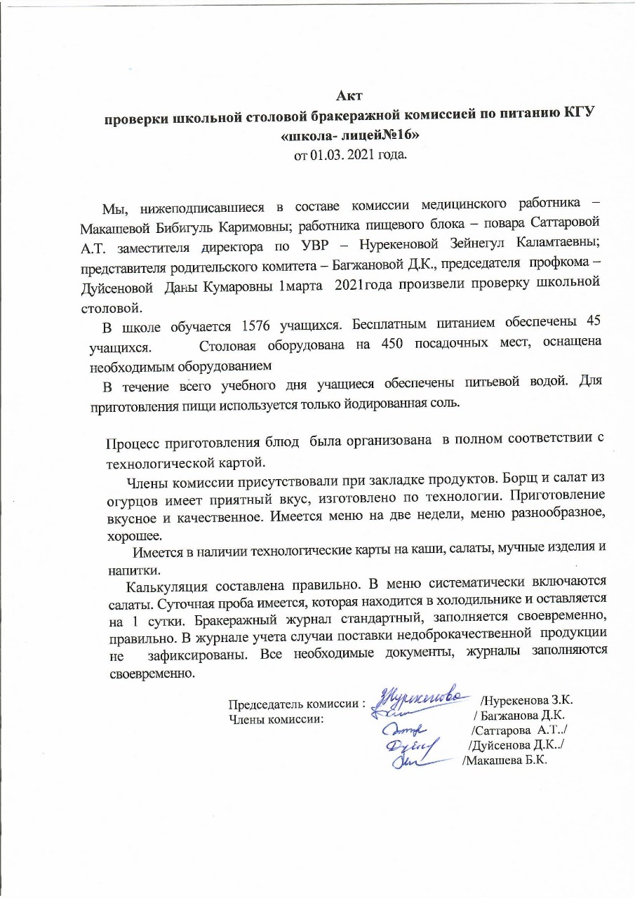 Акт проверки комиссией по контролю за качеством питания столовой школы №16 от 16.09.2021 | Скачать Смотреть |