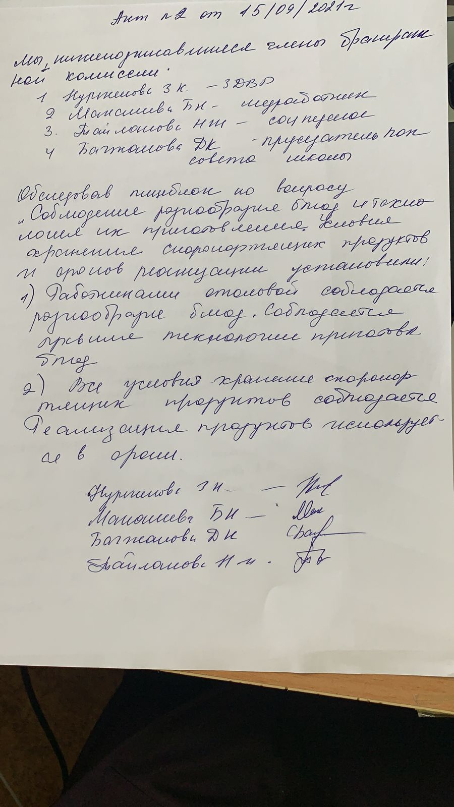 - Акт проверки школьной столовой комиссией по мониторингу за качеством питания в столовой