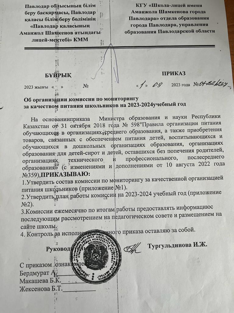Приказ о создании комиссии по мониторингу питание | Скачать |