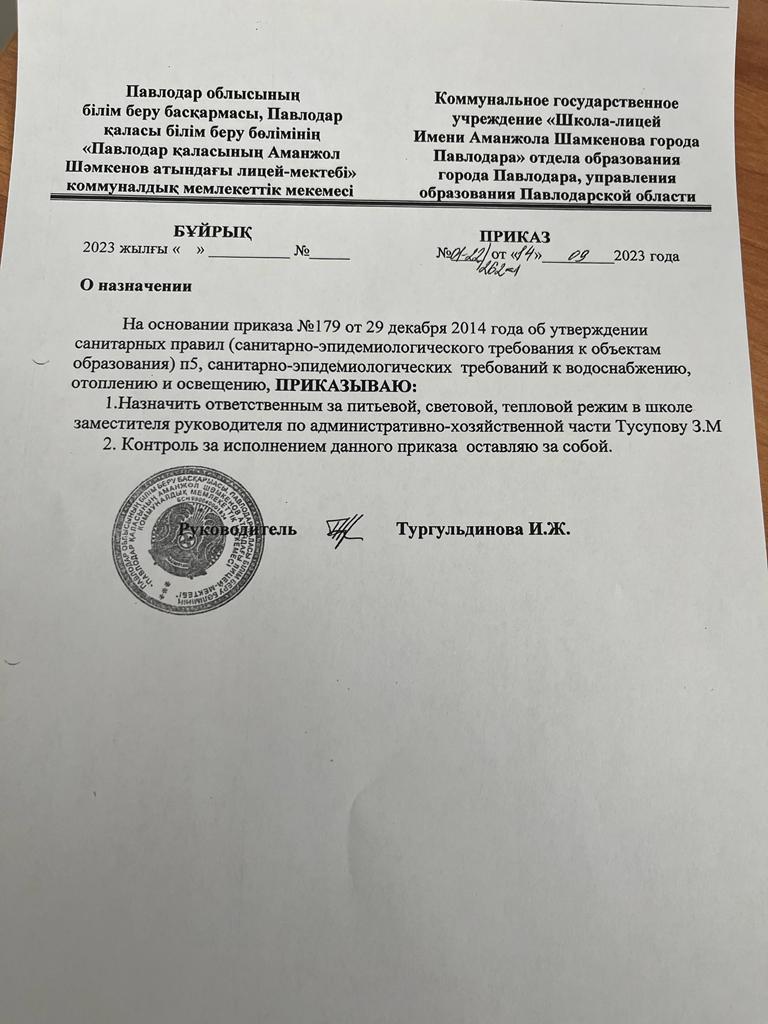 Приказ отв за питьевой, световой, тепловой режим | Скачать |