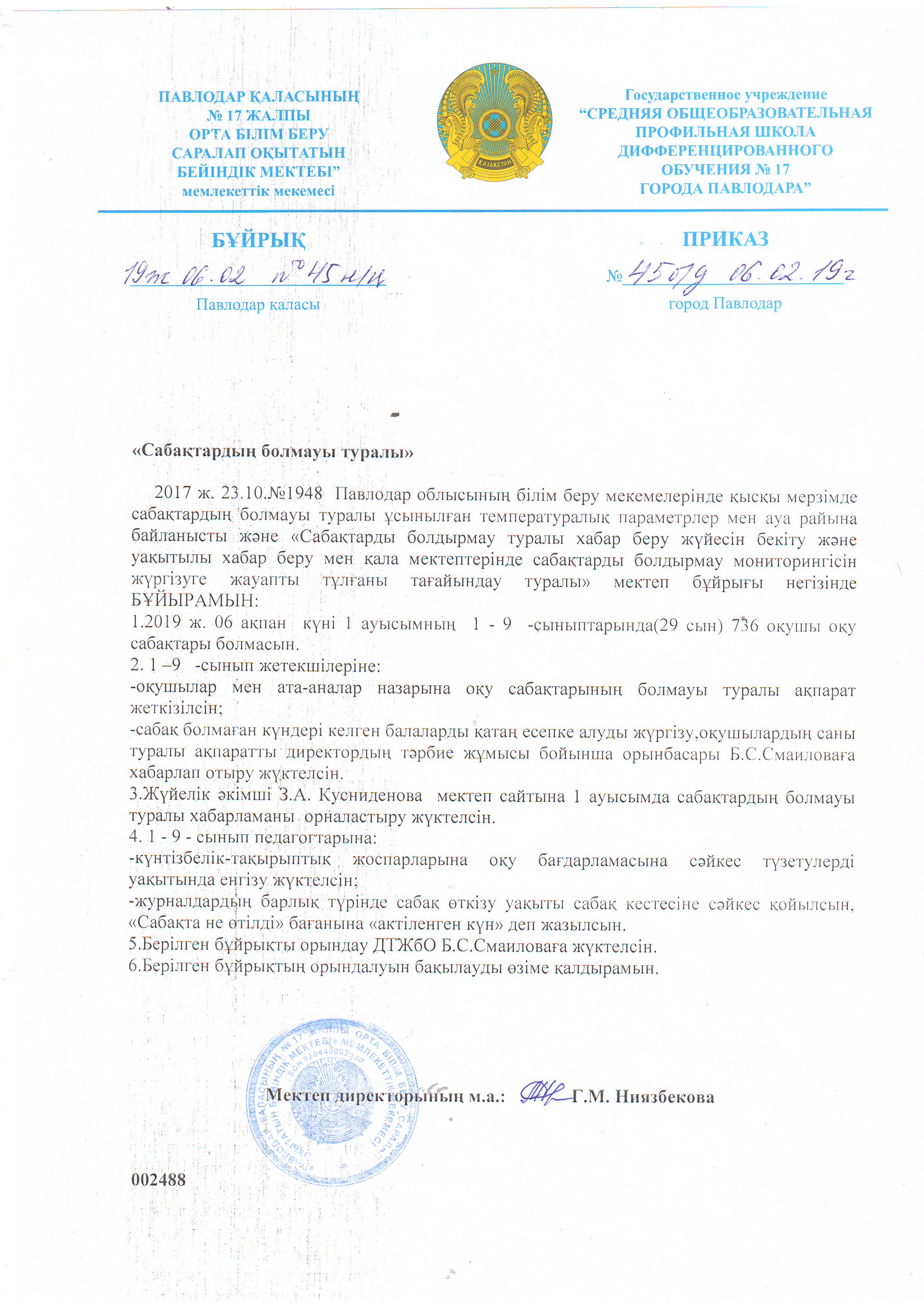 06.02.2019ж 1 ауысымның 1-9 сыныптарында сабақтары болмасын