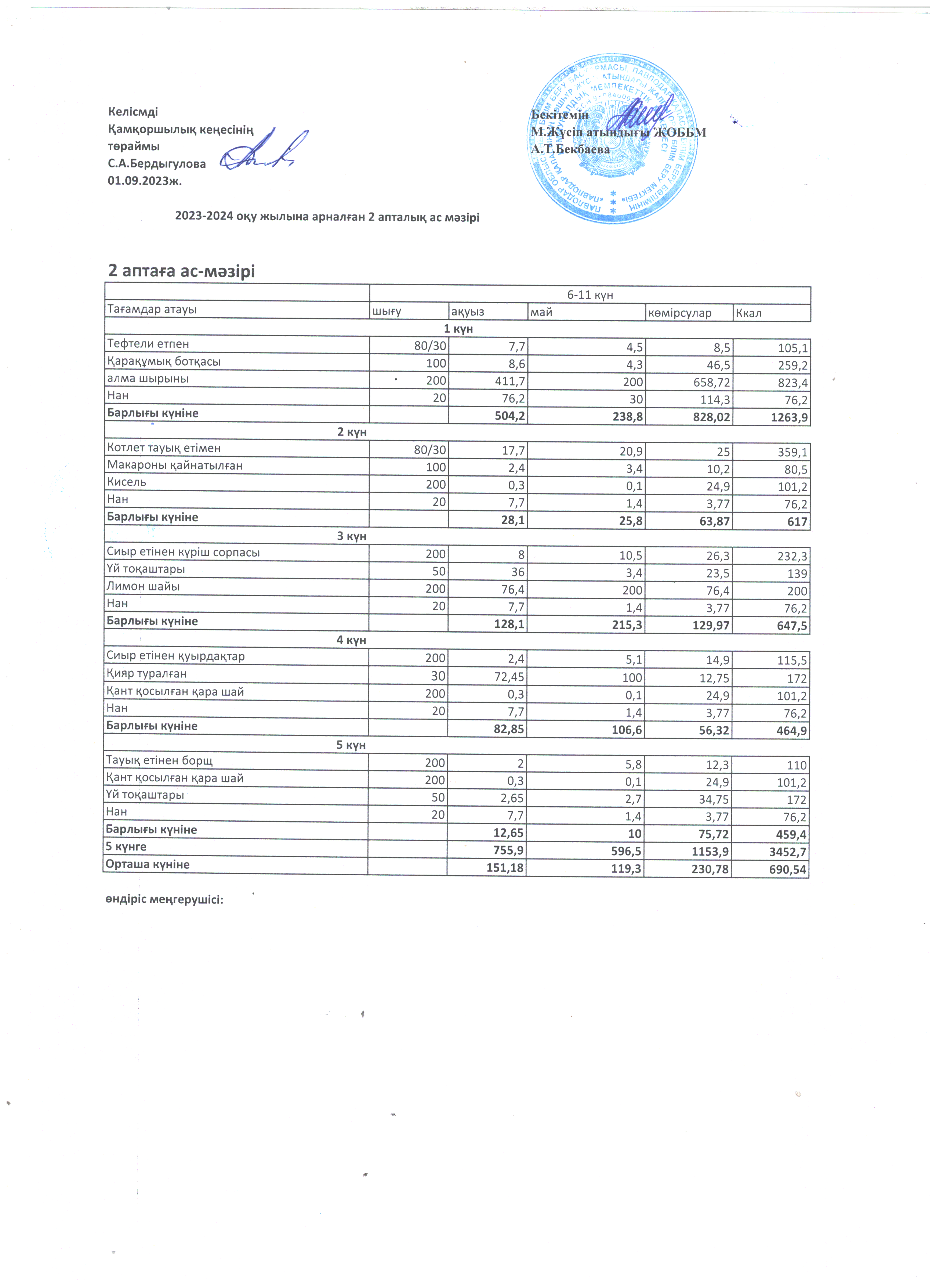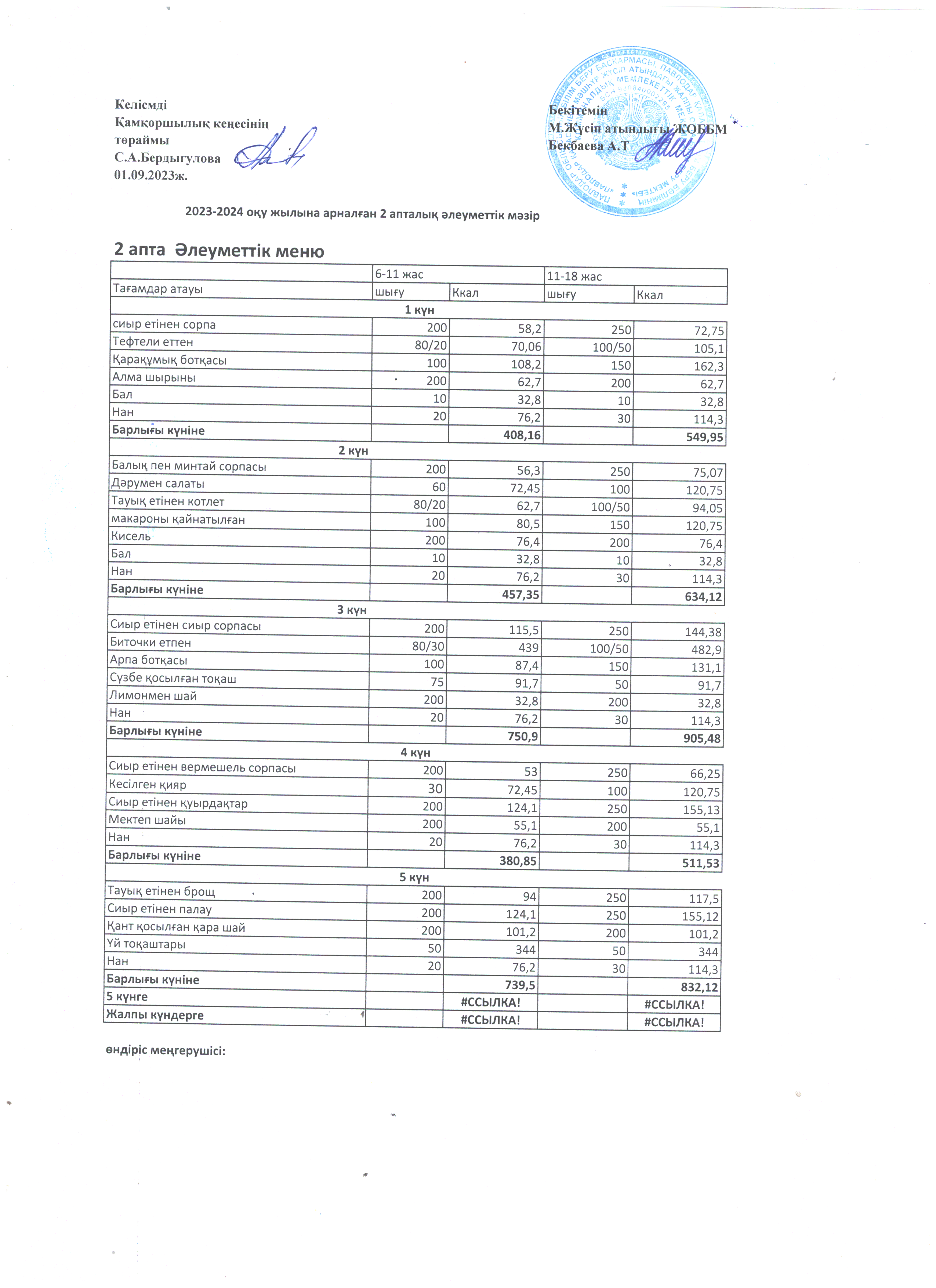 Социальное 1-недельное меню на 2023-2024 учебный год