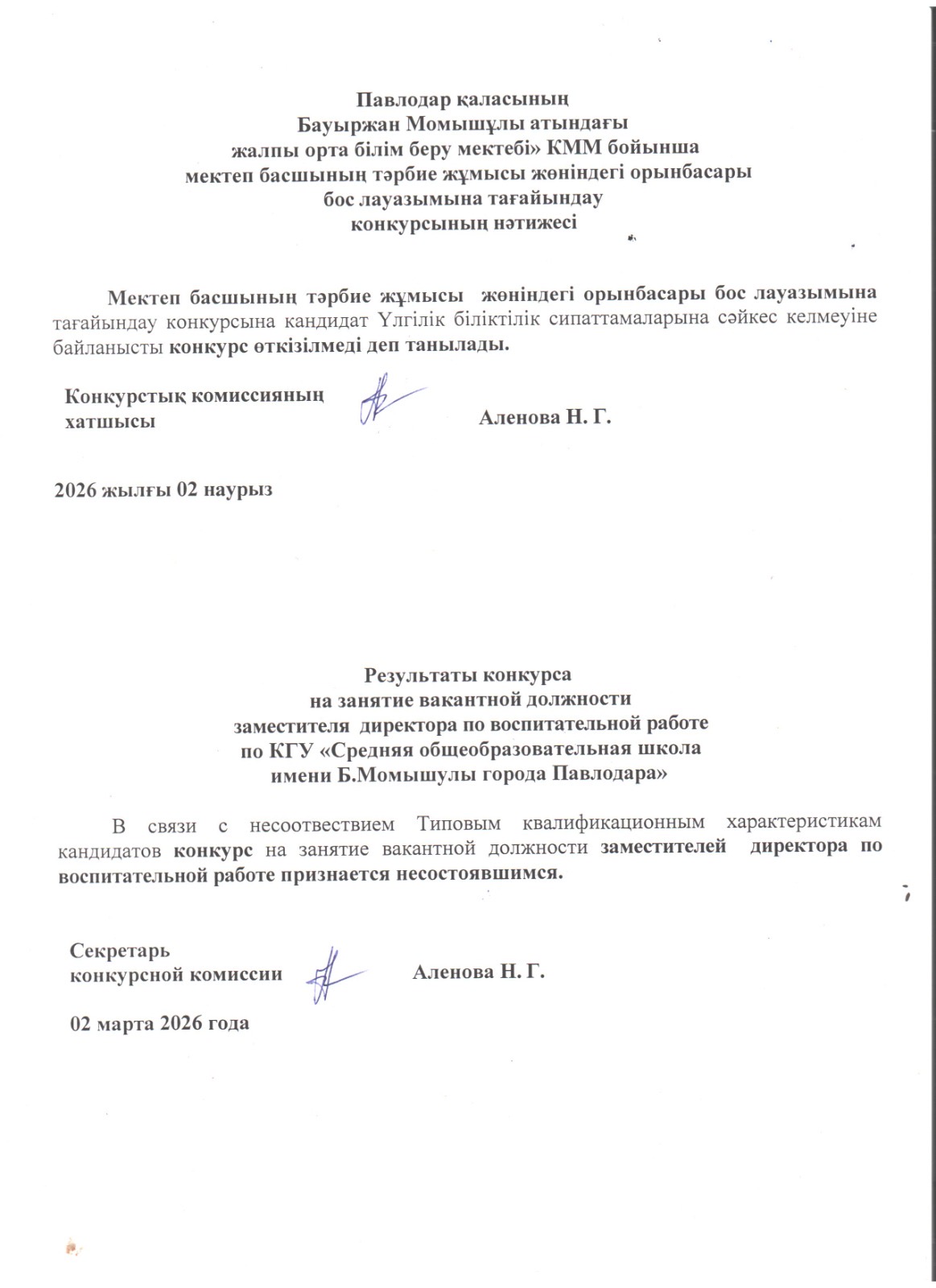 Мектеп басшысының оқу жұмысы жөніндегі орынбасары бос лауазымына тағайындау конкурсының нәтижесі. | Скачать |