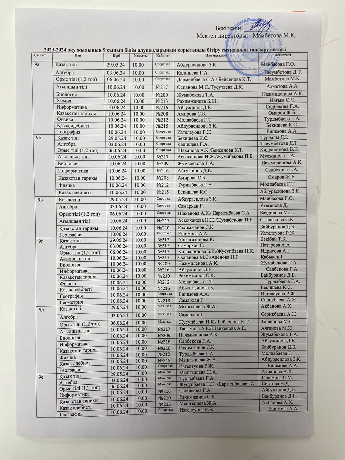 2023-2024 оқу жылына арналған 9-сыныптардағы қорытынды емтихандардың кестесі | Скачать |