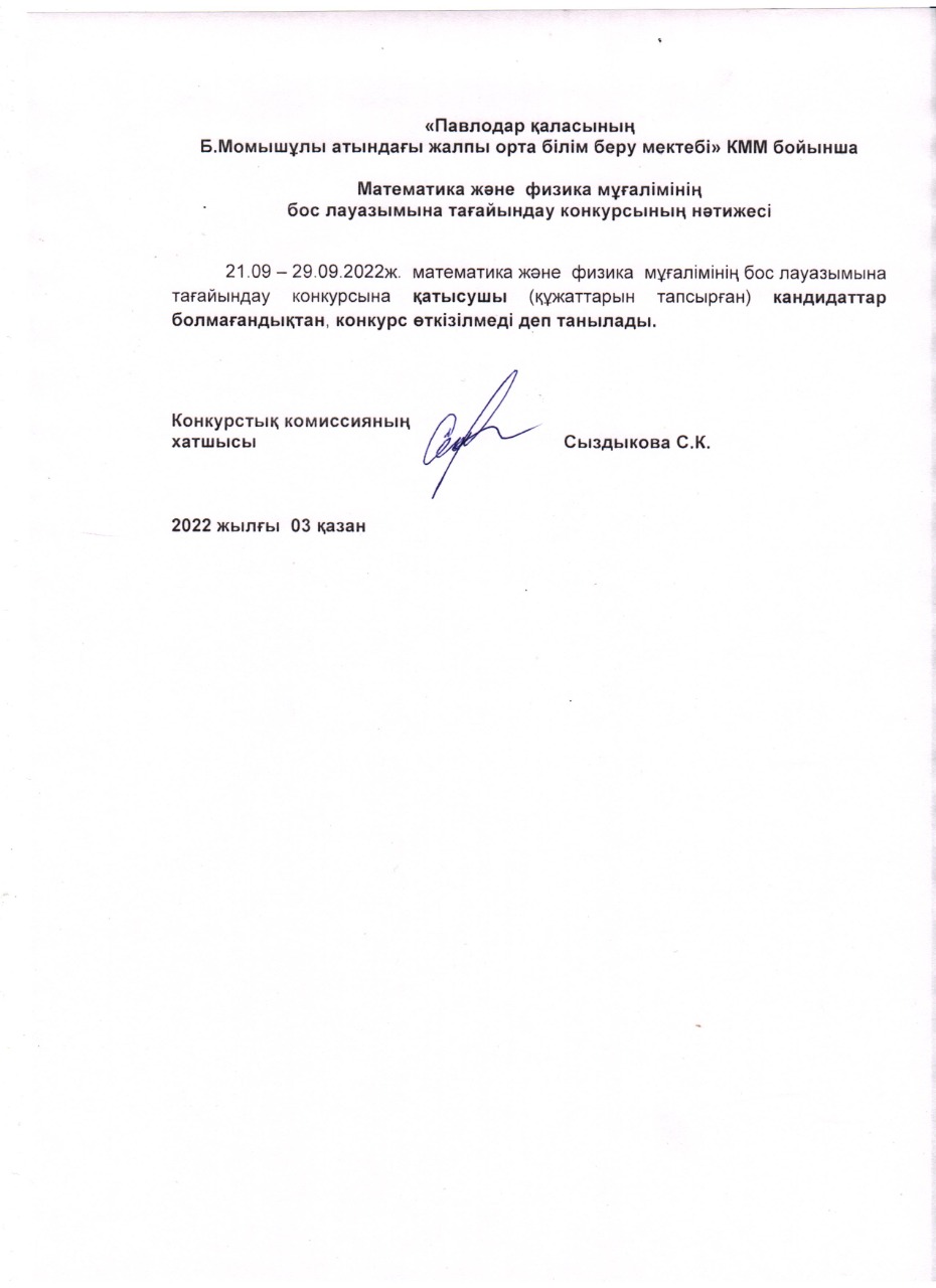 "Павлодар қаласының Б.Момышұлы атындағы жалпы орта білім беру мектебі" КММ бойынша математика және физика мұғалімі бос лауазымына тағайындау конкурсының нәтижесі