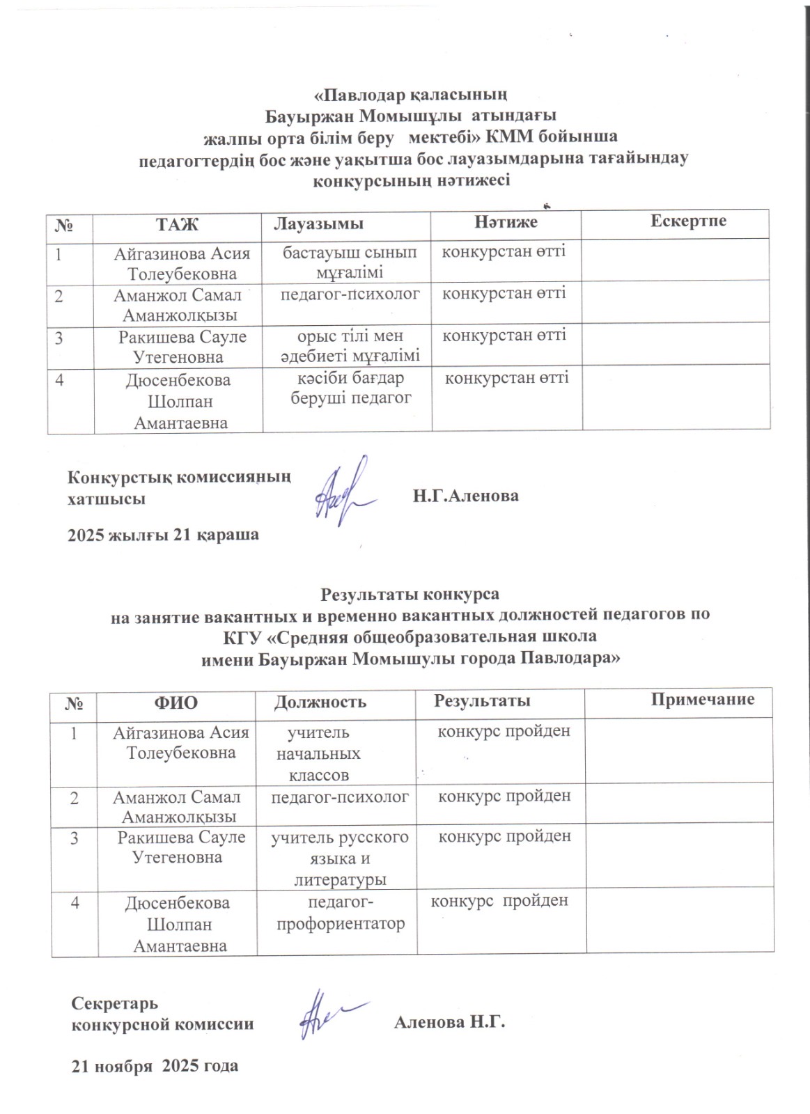 Бастауыш сынып мұғалімі, орыс тілі мен әдебиеті мұғалімі, педагог-психолог, кәсіби бағдар беруші педагог лауазымдарына тағайындау конкурсының нәтижесі.