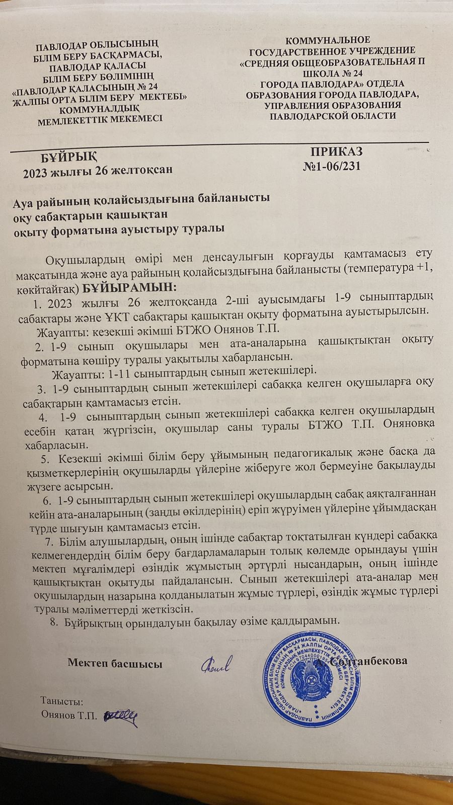 Ауа райының қолайсыздығына байланысты оқу сабақтарын қашықтықтан оқыту форматына көшіру туралы