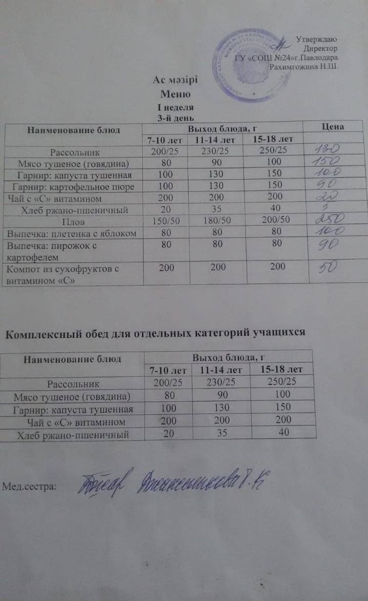 Меню 1 неделя 3 день
